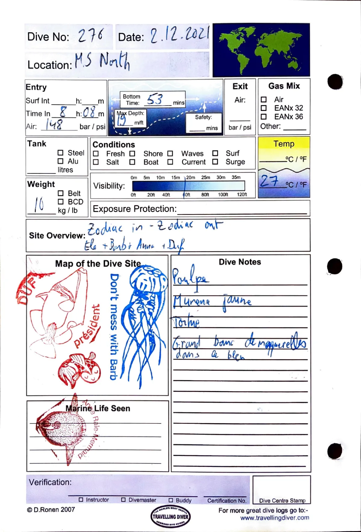 Plongée #276 — Housereef NorthMarsa Shagra 2 décembre 2021🕐 08:08 ⏱ 53 min ↓ 19 m 🌡 27°C 🫧 148 bar ⚖ 10 kg Zodiac in / zodiac outAvec Elo + Barb + Anne + DufPoulpe. Murene jaune. Tortue. Grand banc de maquerelles dans le bleuPage du carnet