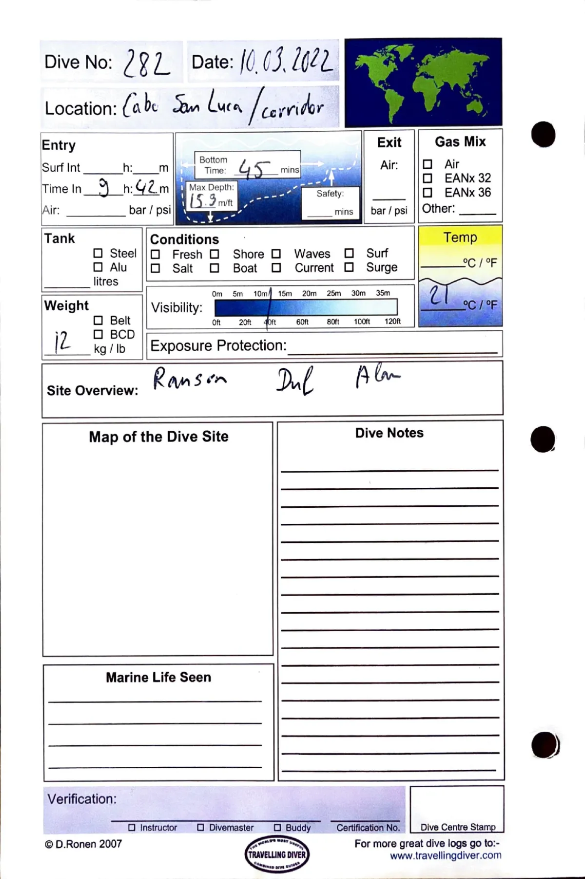 Plongée #282 — CorridorCabo San Lucas 10 mars 2022🕐 09:42 ⏱ 45 min ↓ 15.3 m 🌡 21°C ⚖ 12 kgAvec Ranson, Duf, AlanPage du carnet