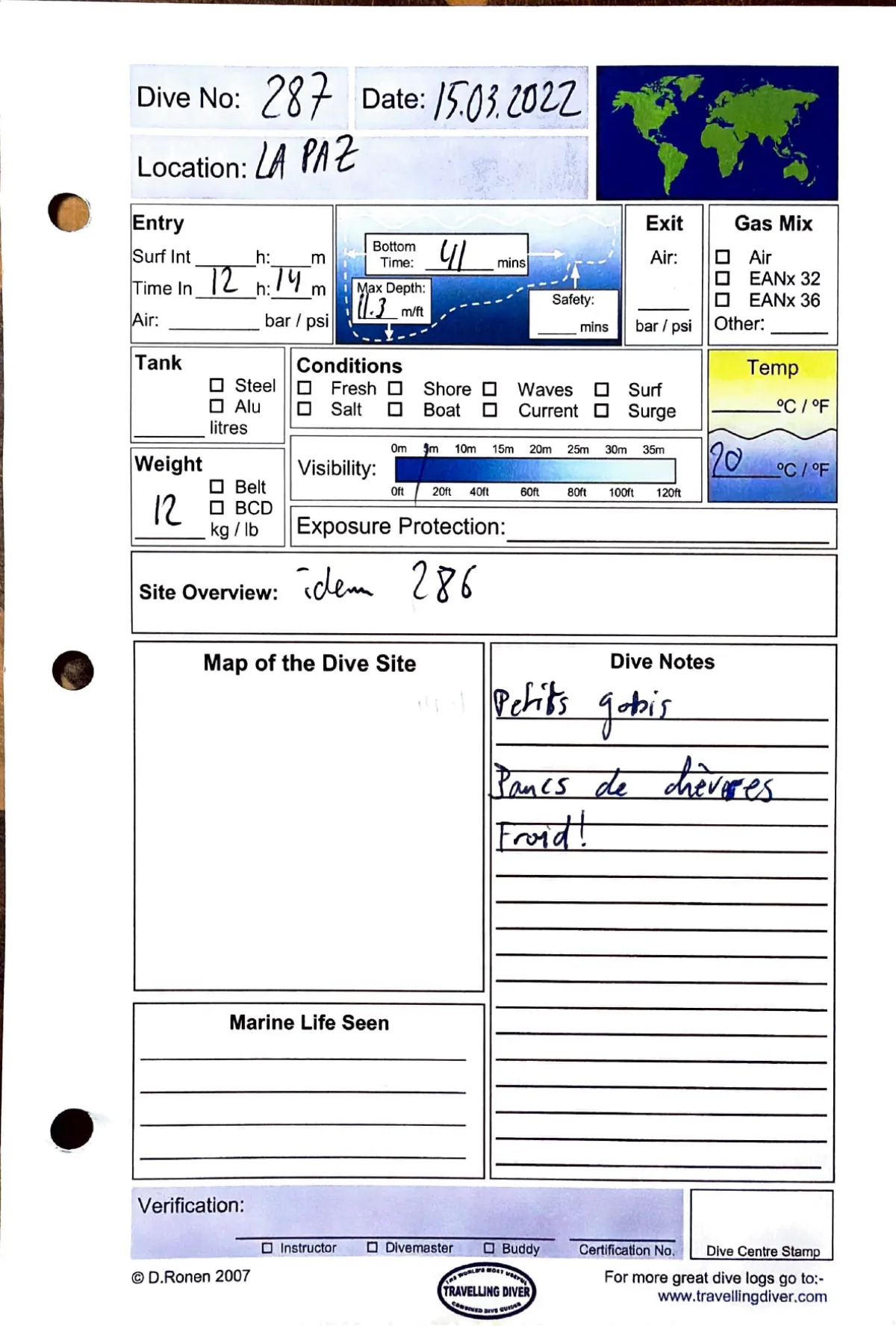 Plongée #287 — La PazLa Paz 15 mars 2022🕐 12:14 ⏱ 41 min ↓ 11.3 m 🌡 20°C ⚖ 12 kgAvec idem 286Petits gobis. Bancs de chevres. Froid!Page du carnet