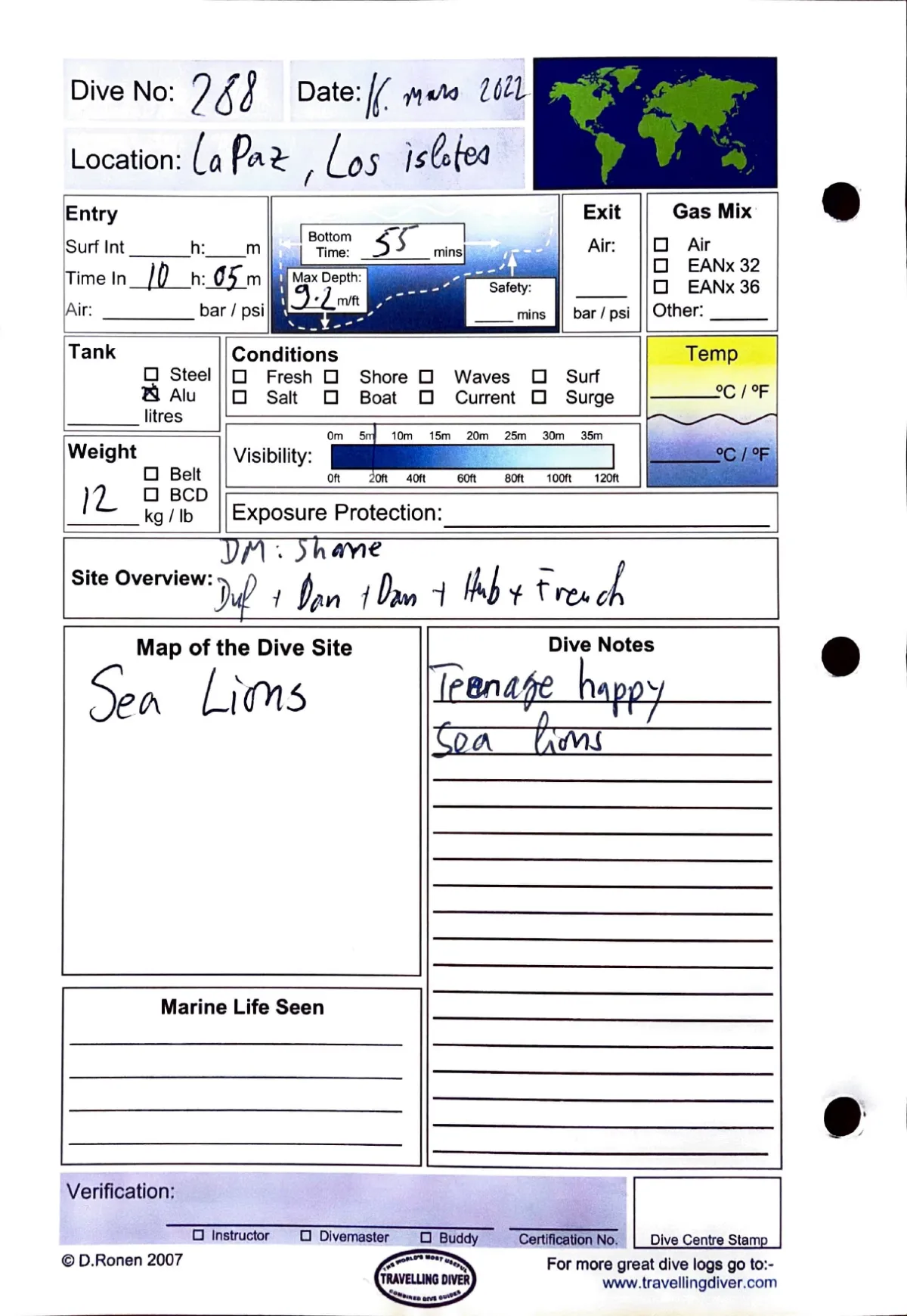 Plongée #288 — Los IslotesLa Paz 16 mars 2022Sea lion in la paz — 16 mars 2022🕐 10:05 ⏱ 55 min ↓ 9.2 m ⚖ 12 kgAvec DM Shane, Duf + Dan + Dan + Hub + FrenchTeenage happy sea lionsPage du carnet