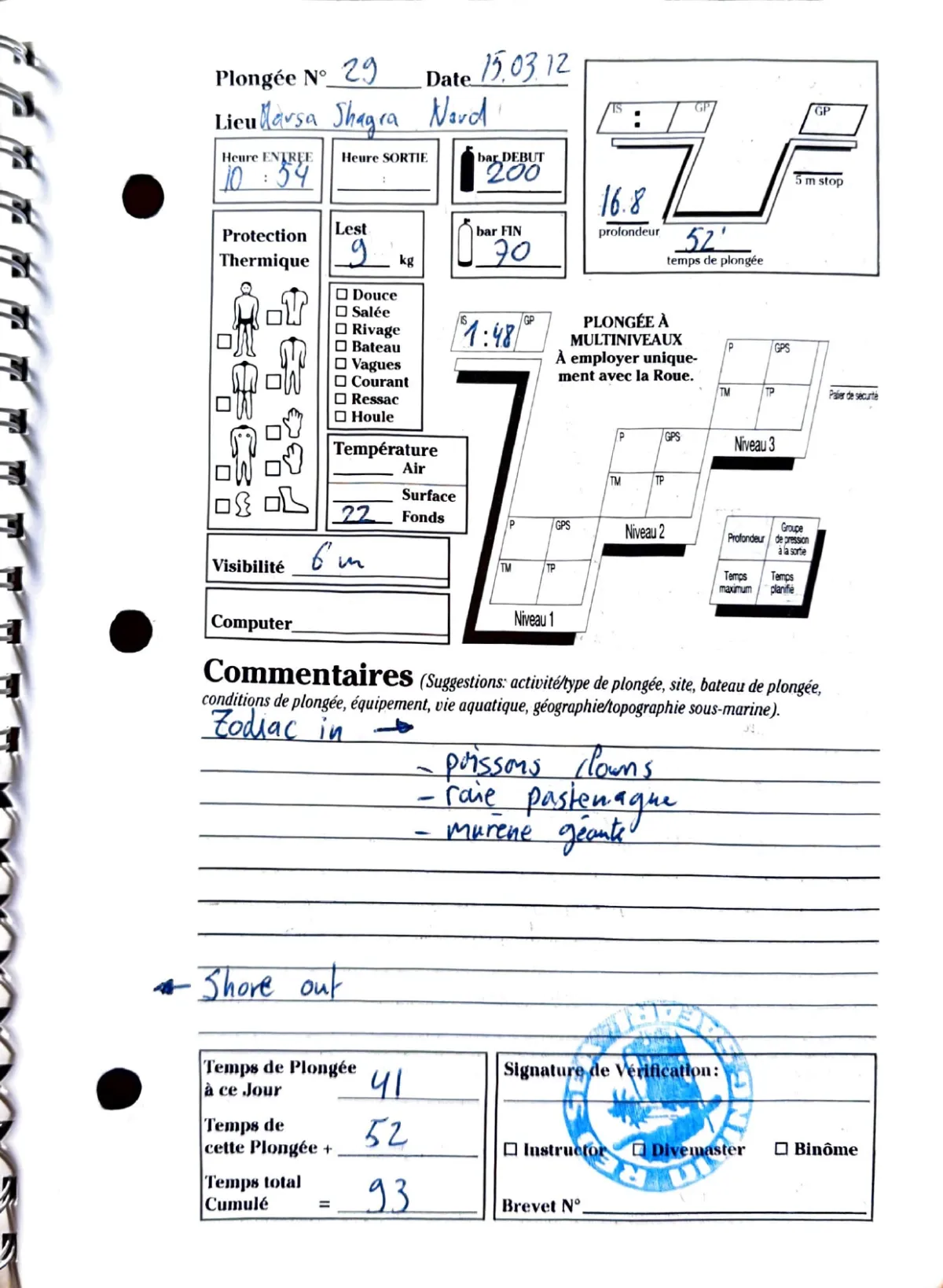 Plongée #29 — Marsa Shagra NordMarsa Shagra 15 mars 2012🕐 10:54 ⏱ 52 min ↓ 16.8 m 🌡 22°C 🫧 130 bar ⚖ 9 kg bateauPoissons clowns, raie pastenague, murene geante. Zodiac in, shore outPage du carnet