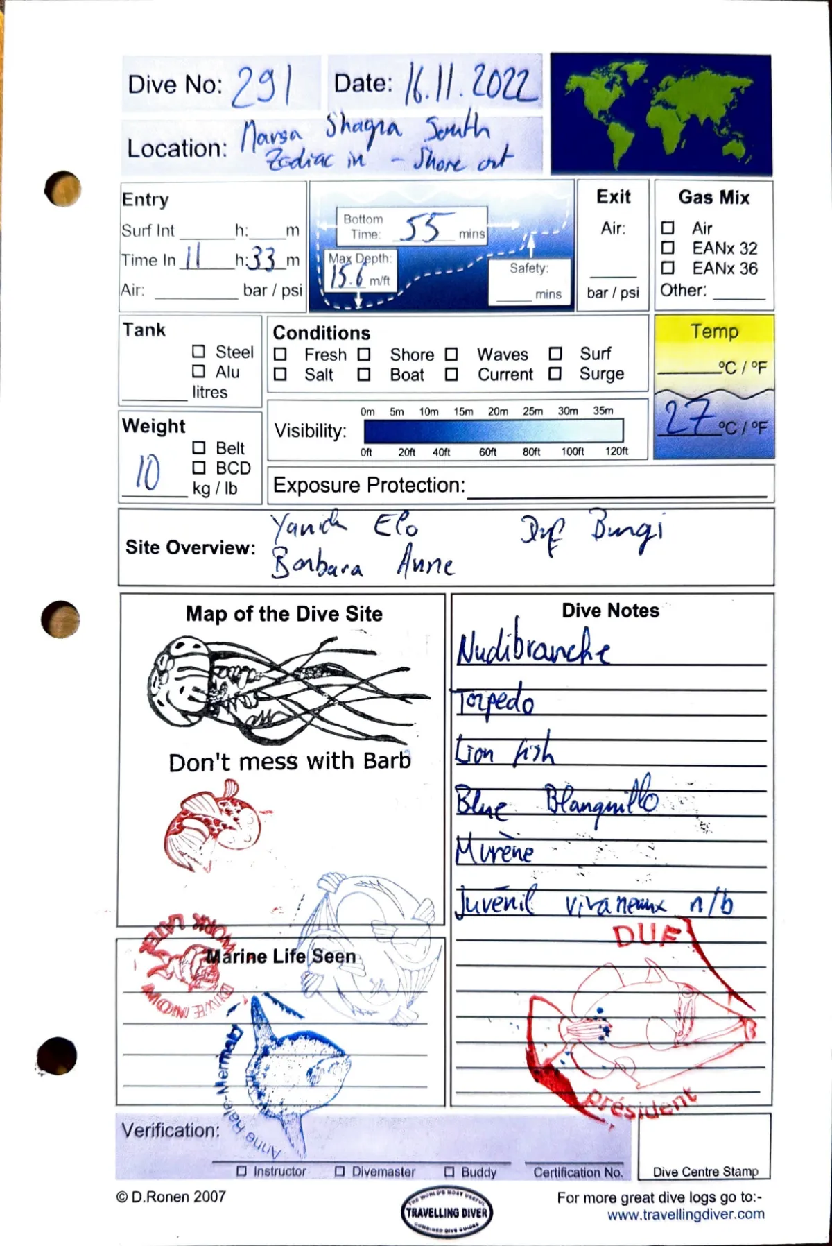 Plongée #291 — Housereef SouthMarsa Shagra 16 novembre 2022🕐 11:33 ⏱ 55 min ↓ 15.6 m 🌡 27°C ⚖ 10 kg Zodiac in / shore outAvec Yanick, Elo, Barbara, Anne, Duf, BungiNudibranche. Torpedo. Lion fish. Blue blanquillo. Murene. Juvenil vivanaux n/b (noir/blanc?)Page du carnet