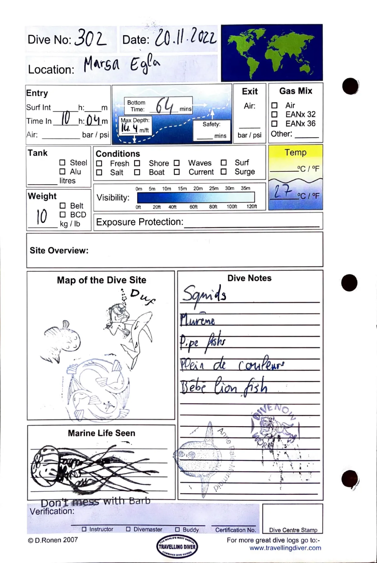 Plongée #302 — Mara EglaMarsa Shagra 20 novembre 2022Dugong — 20 novembre 2022🕐 10:04 ⏱ 64 min ↓ 14.4 m 🌡 27°C ⚖ 10 kgSquids. Murene. Pipe fishs. Plein de couleur. Bebe lion fishPage du carnet