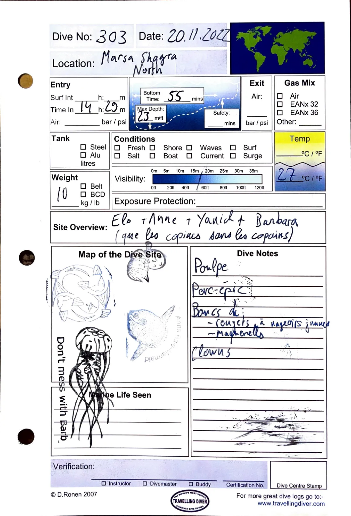 Plongée #303 — Housereef NorthMarsa Shagra 20 novembre 2022🕐 14:29 ⏱ 55 min ↓ 23 m 🌡 27°C ⚖ 10 kgAvec Elo + Anne + Yanick + Barbara (que les copines sans les copains)Poulpe. Porc-epic. Bancs de rougets a nageoires jaunes + maquerella. ClownsPage du carnet