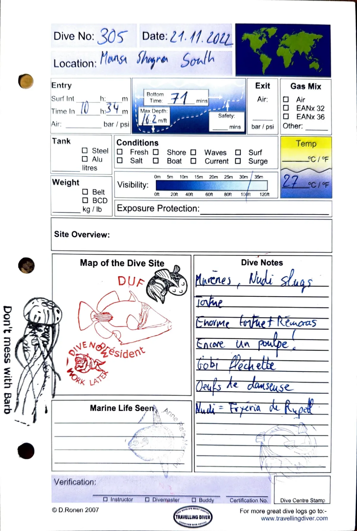 Plongée #305 — Housereef SouthMarsa Shagra 21 novembre 2022🕐 10:34 ⏱ 71 min ↓ 16.2 m 🌡 27°C ⚖ 10 kgMurenes. Nudi slugs. Tortue. Enorme tortue + remoras. Encore un poulpe. Gobi flechette. Oeufs de danseuse. Nudi = Fryeria de RuppellPage du carnet