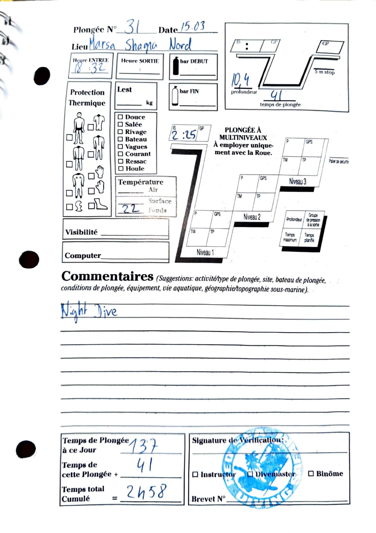Plongée #31 — Marsa Shagra NordMarsa Shagra 15 mars 2012🕐 18:32 ⏱ 41 min ↓ 10.4 m 🌡 22°C rivageNight divePage du carnet