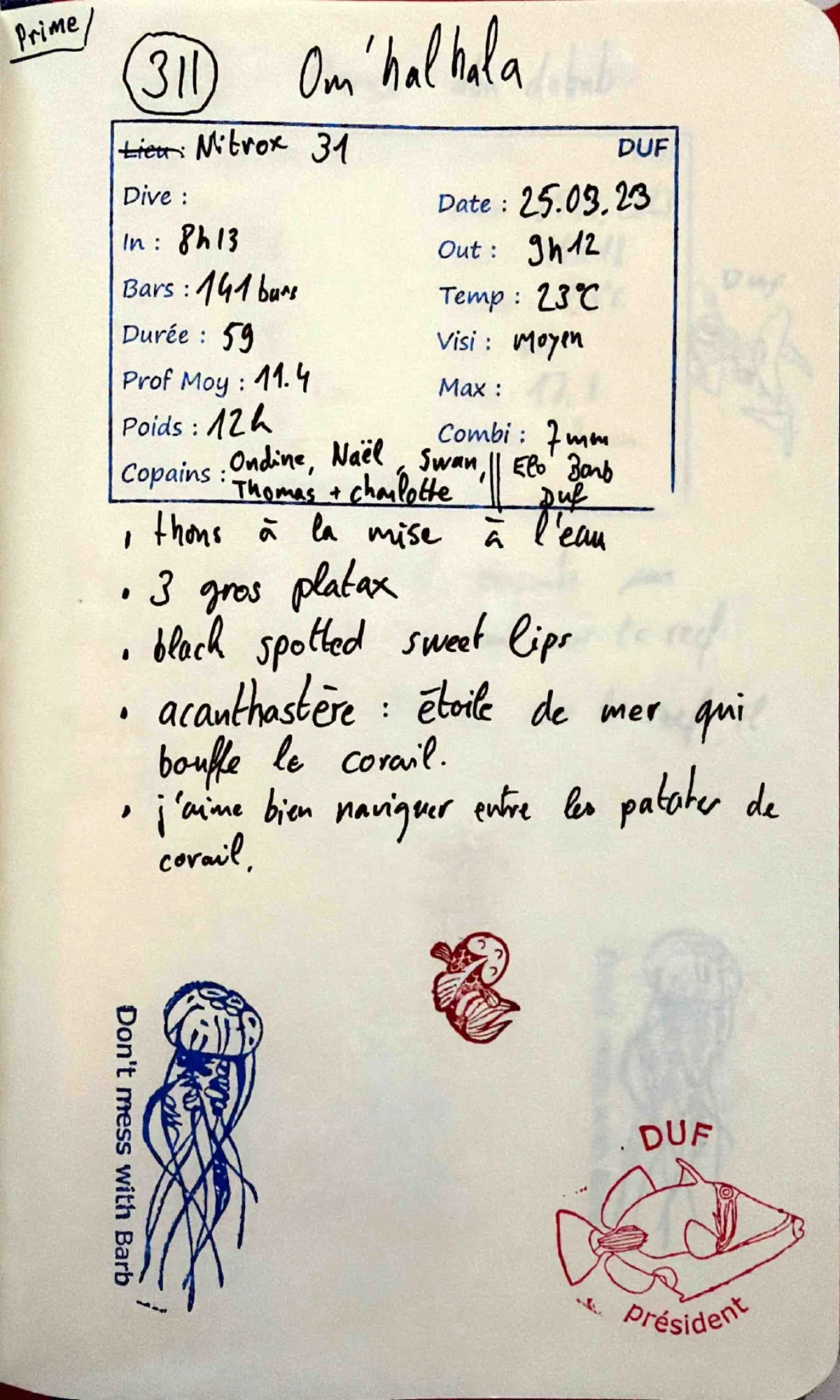 Nitrox 31. Combi 7mm. Prof moy 11.4m. Max non note. Visi moyen. Out 09:12. "Prime!". "Lieu" dans le carnet = "Nitrox 31" (erreur de champ). Thons a la mise a l'eau. 3 gros platax. Black spotted sweet lips. Acanthastere : etoile de mer qui bouffe le corail. J'aime bien naviguer entre les patates de corail