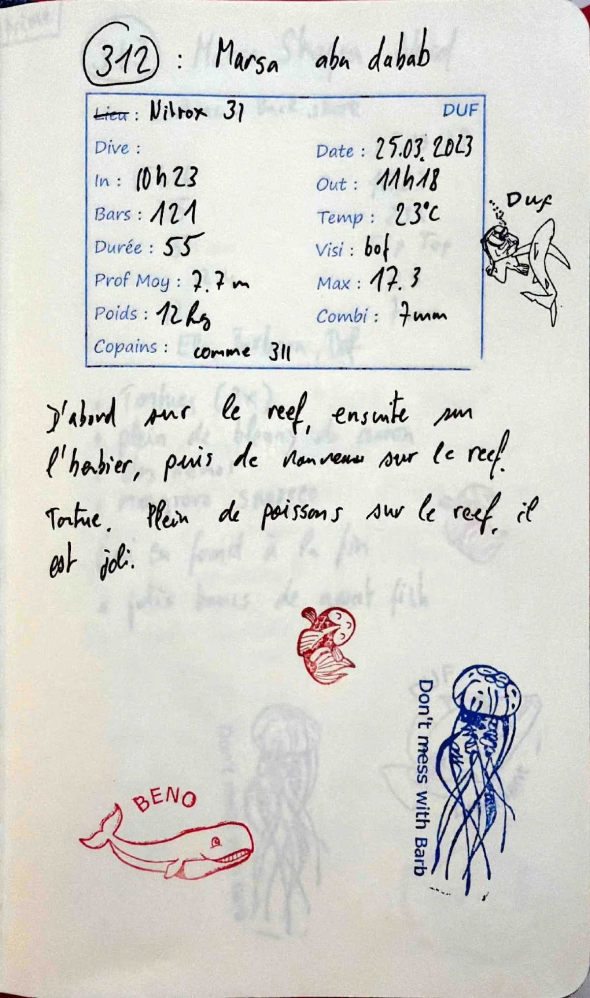 Nitrox 31. Combi 7mm. Prof moy 7.7m. Visi bof. Out 11:18. Copains "comme 311". D'abord sur le reef, ensuite sur l'herbier, puis de nouveau sur le reef. Tortue. Plein de poissons sur le reef, il est joli