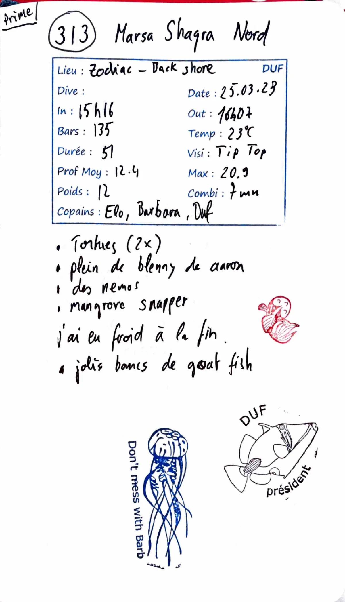Combi 7mm. Prof moy 12.4m. Visi Tip Top. Out 16:07. "Prime!". Tortues (2x). Plein de blenny de Aaron. Des nemos. Mangrove snapper. J'ai eu froid a la fin. Jolis bancs de goat fish