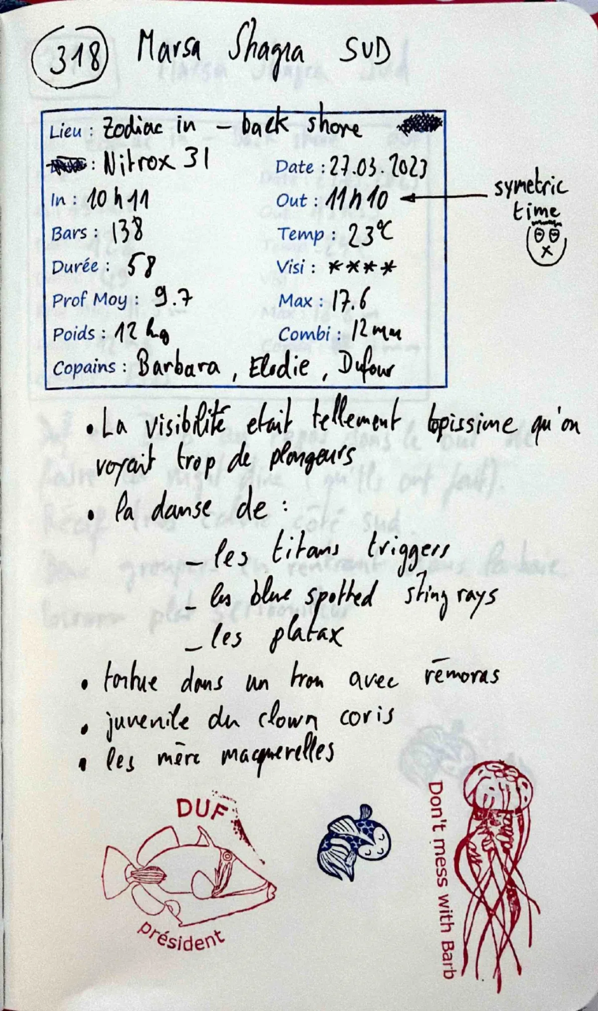 Nitrox 31. Combi 12mm. Prof moy 9.7m. Visi ****. Out 11:10 ("symetric time"). La visibilite etait tellement topissime qu'on voyait trop de plongeurs. La danse de : les titans triggers, les blue spotted sting rays, les platax. Tortue dans un trou avec remoras. Juvenile du clown coris. Les meres maquerelles