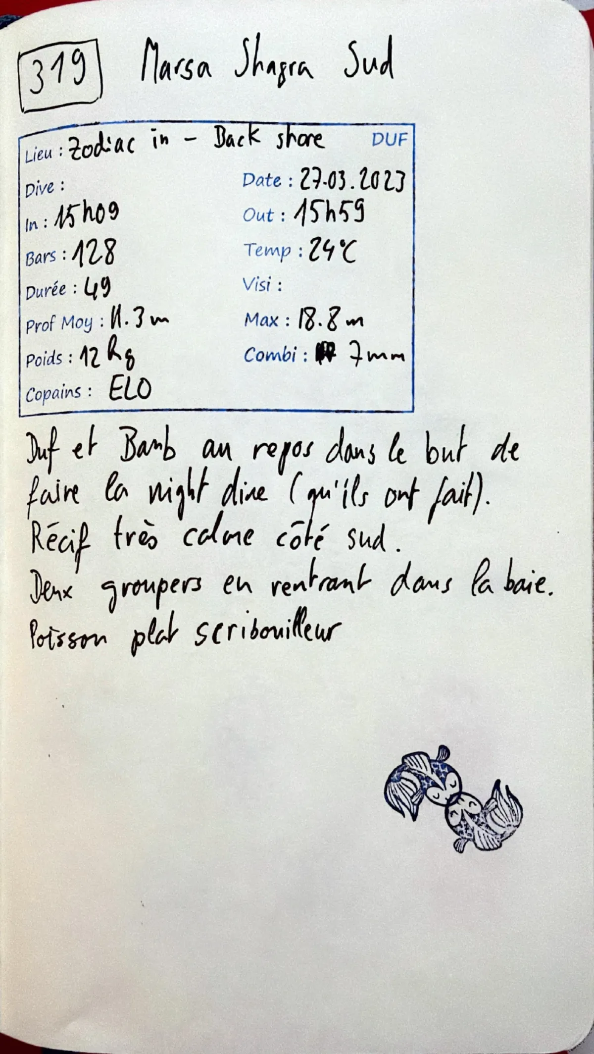 Combi 7mm. Prof moy 11.3m. Out 15:59. Duf et Barb au repos dans le but de faire la night dive (qu'ils ont fait). Recif tres calme cote sud. Deux groupers en rentrant dans la baie. Poisson plat scribouilleur