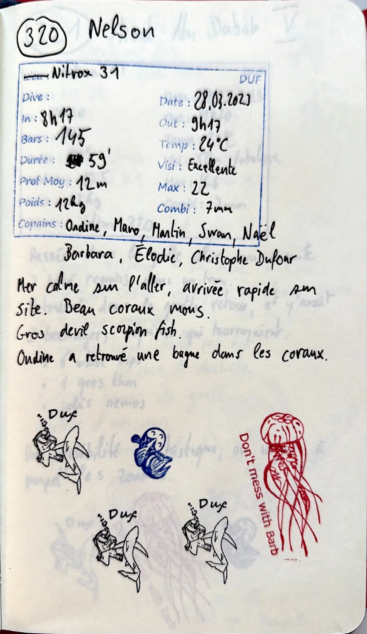 Plongée #320 — Nelson (Abu Dabab)Marsa Shagra 28 mars 2023🕐 08:17 ⏱ 59 min ↓ 22 m 🌡 24°C 🫧 145 bar ⚖ 12 kgOndine Mano Martin Swan Nael Barbara Elo DufNitrox 31. Combi 7mm. Prof moy 12m. Visi excellente. Out 09:17. Mer calme sur l'aller, arrivee rapide sur site. Beau coraux mous. Gros devil scorpion fish. Ondine a retrouve une bague dans les corauxVie marineDevil ScorpionfishPage du carnet