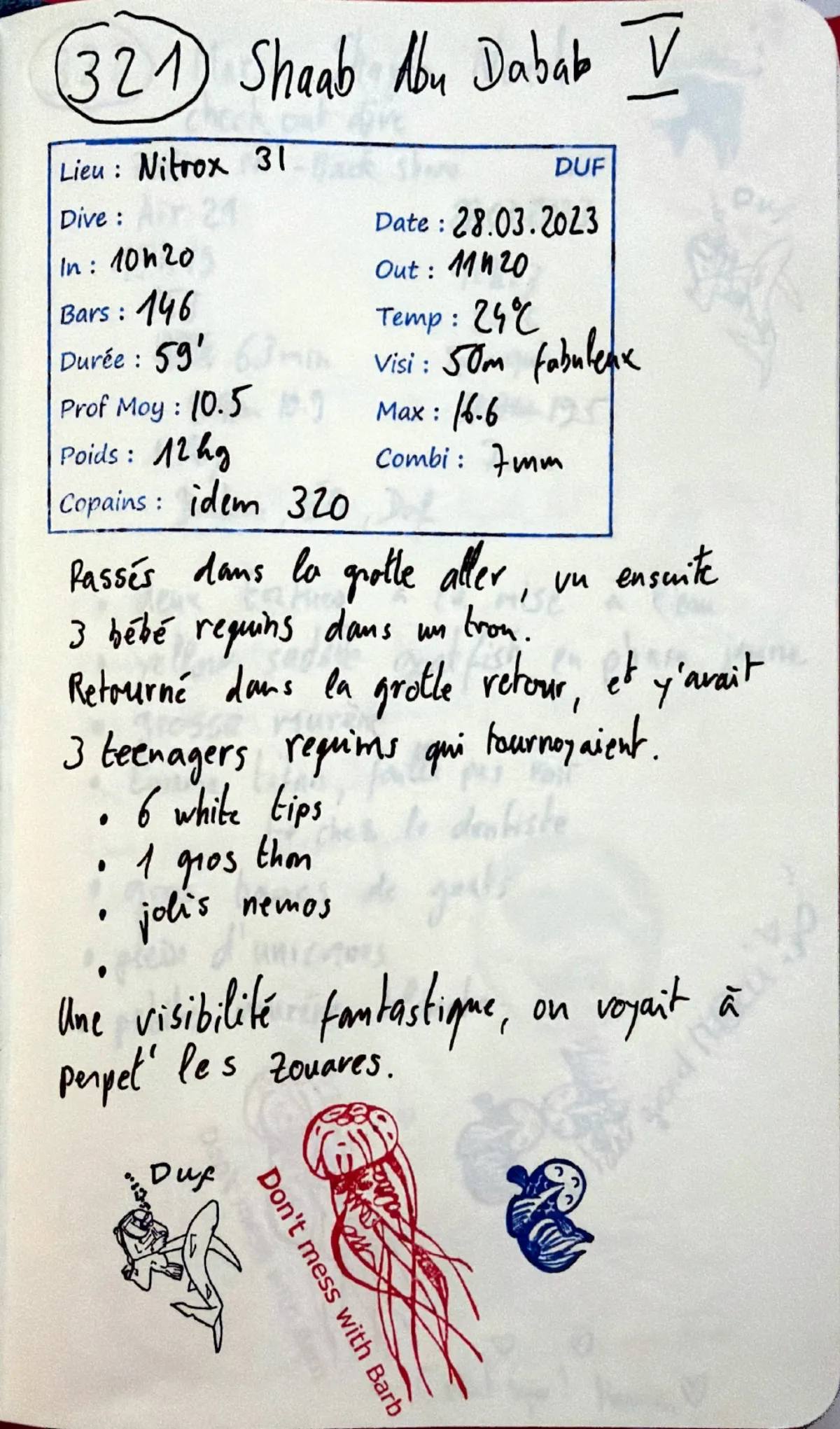 Nitrox 31. Combi 7mm. Prof moy 10.5m. Visi 50m fabuleux. Out 11:20. Copains "idem 320". Passes dans la grotte aller, vu ensuite 3 bebe requins dans un trou. Retourne dans la grotte retour, et y'avait 3 teenagers requins qui tournoyaient. 6 white tips. 1 gros thon. Jolis nemos. Une visibilite fantastique, on voyait a perpet' les zouaves