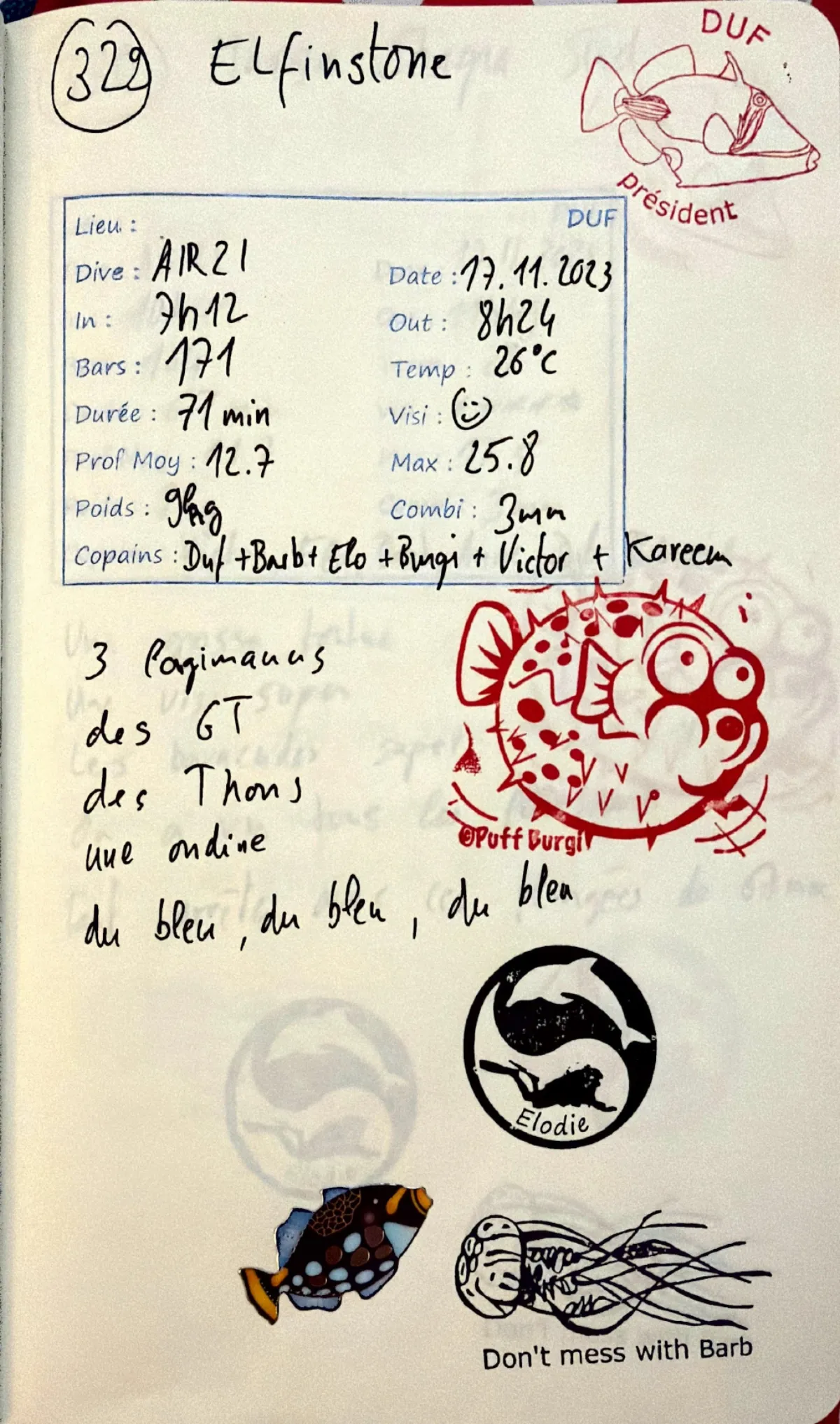 Plongée #329 — ElphinstoneMarsa Shagra 17 novembre 2023🕐 07:12 ⏱ 71 min ↓ 25.8 m 🌡 26°C 🫧 171 bar ⚖ 9 kgDuf Barbara Elo Burgi Victor KareemAir 21. Combi 3mm. Prof moy 12.7m. Visi :). Out 08:24. 3 longimanus! Des GT. Des thons. Une ondine. Du bleu, du bleu, du bleuVie marineOceanic Whitetip Shark Giant Trevally TunaPage du carnet