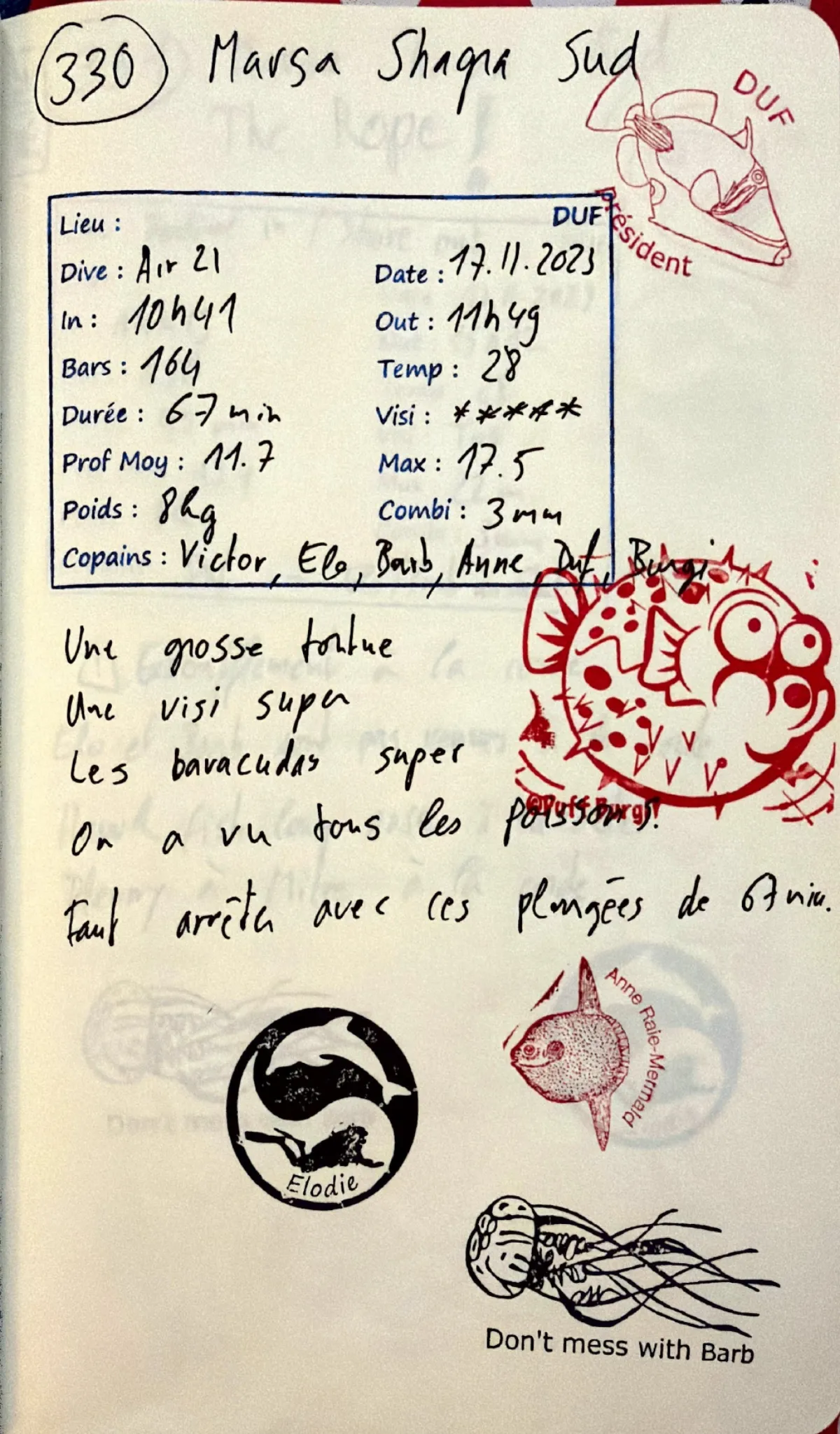 Plongée #330 — Housereef SouthMarsa Shagra 17 novembre 2023🕐 10:41 ⏱ 67 min ↓ 17.5 m 🌡 28°C 🫧 164 bar ⚖ 8 kgVictor Elo Barbara Anne Duf BurgiAir 21. Combi 3mm. Prof moy 11.7m. Visi *****. Out 11:49. "The Rope". Une grosse tortue. Une visi super. Les barracudas super. On a vu tous les poissons! Faut arreter avec ces plongees de 67 minVie marineSea Turtle BarracudaPage du carnet