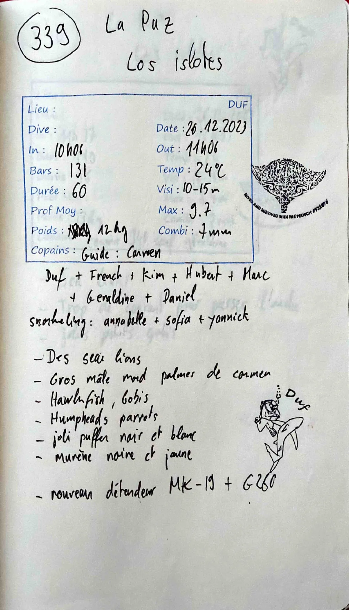 Combi 7mm. Out 11:06. Visi 10-15m. Snorkeling: Annabelle + Sofia + Yannick. Nouveau detendeur MK-19 + G260. Des sea lions. Gros male mord palmes de Carmen. Humpheads parrots. Joli puffer noir et blanc. Murene noire et jaune