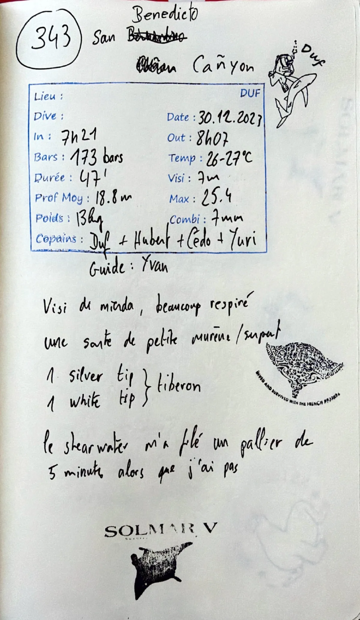 Combi 7mm. Out 08:07. Visi 7m. Prof moy 18.8m. Visi de mierda, beaucoup respire. Une sorte de petite murene/serpent. 1 silver tip, 1 white tip. Le shearwater m'a file un pallier de 5 minutes alors que j'ai pas depasse