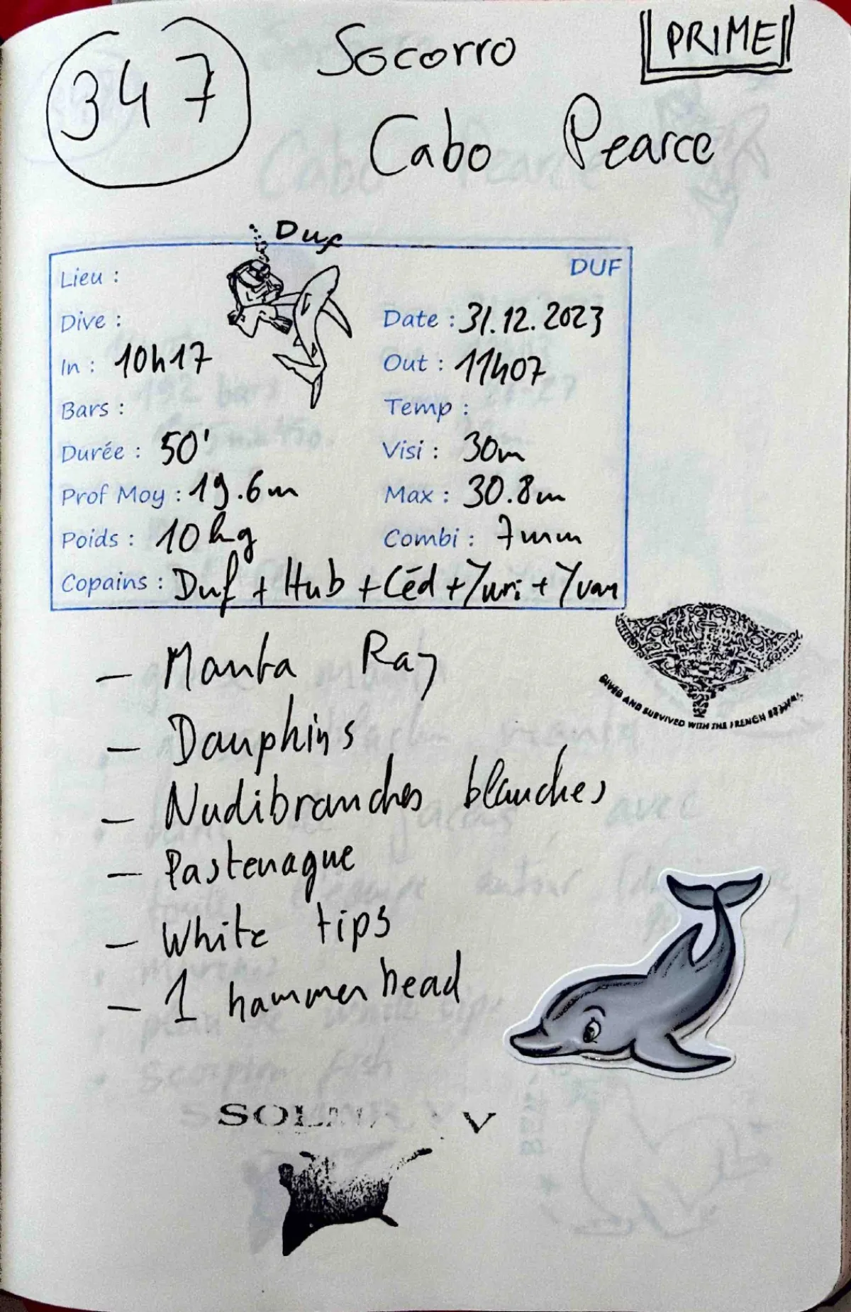 Plongée #347 — Cabo Pearce 🔢Socorro 31 décembre 2023🕐 10:17 ⏱ 50 min ↓ 30.8 m ⚖ 10 kg BoatDuf Hubert Ced Yuri YvanPRIME! Combi 7mm. Out 11:07. Visi 30m. Prof moy 19.6mVie marineManta Ray Dolphin Nudibranch Stingray Whitetip Reef Shark Hammerhead SharkPage du carnet