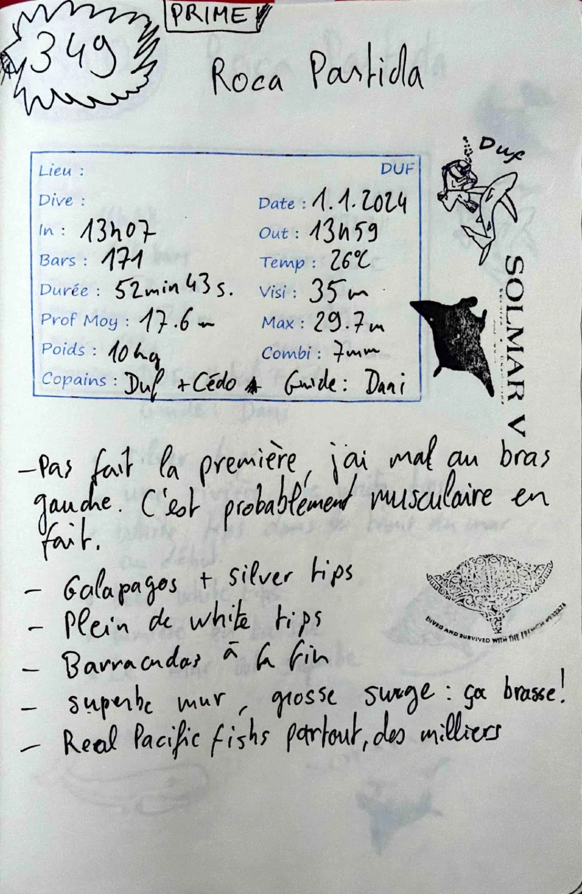 PRIME! Combi 7mm. Out 13:59. Visi 35m. Prof moy 17.6m. Pas fait la premiere, j'ai mal au bras gauche. C'est probablement musculaire en fait. Superbe mur, grosse surge: ca brasse! Real Pacific fishs partout, des milliers