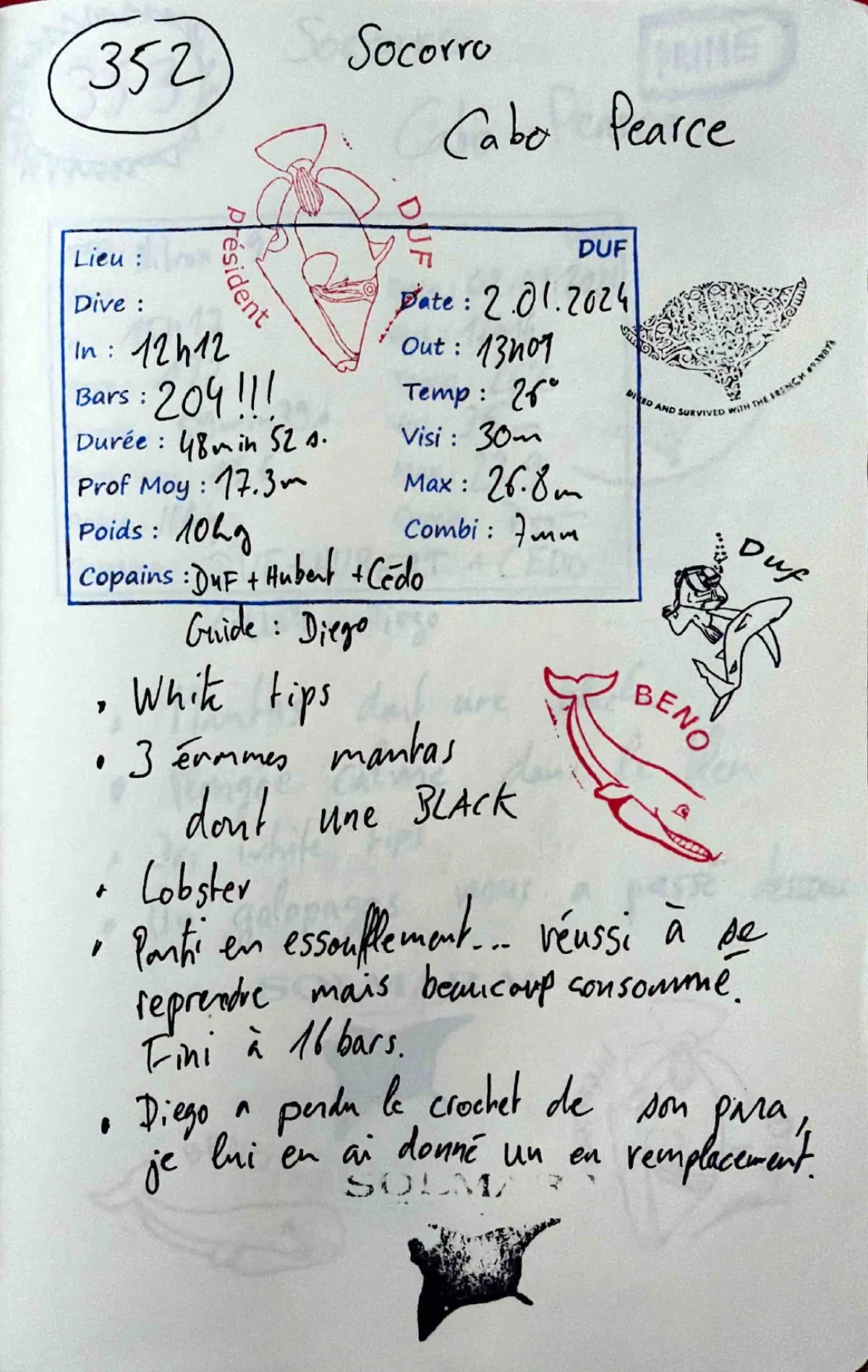 Combi 7mm. Out 13:07. Visi 30m. Prof moy 17.3m. 204 bars au depart! Parti en essoufflement... reussi a reprendre mais beaucoup consomme. Fini a 16 bars. Diego a perdu le crochet de son para, je lui en ai donne un en remplacement