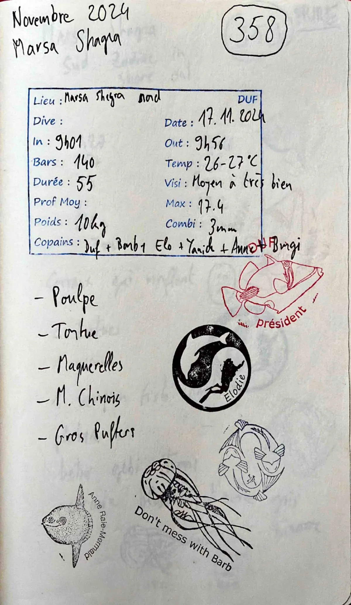 Plongée #358 — Housereef NorthMarsa Shagra 17 novembre 2024🕐 09:01 ⏱ 55 min ↓ 17.4 m 🌡 26-27°C 🫧 140 bar ⚖ 10 kgDuf Barbara Elo Yanick Anne BurgiCombi 3mm. Out 09:56. Visi moyen a tres bien. Poulpe. Tortue. Maquerelles. M. Chinois. Gros PuffersVie marineOctopus Sea Turtle Indian Mackerel Sling-Jaw Wrasse PufferfishPage du carnet