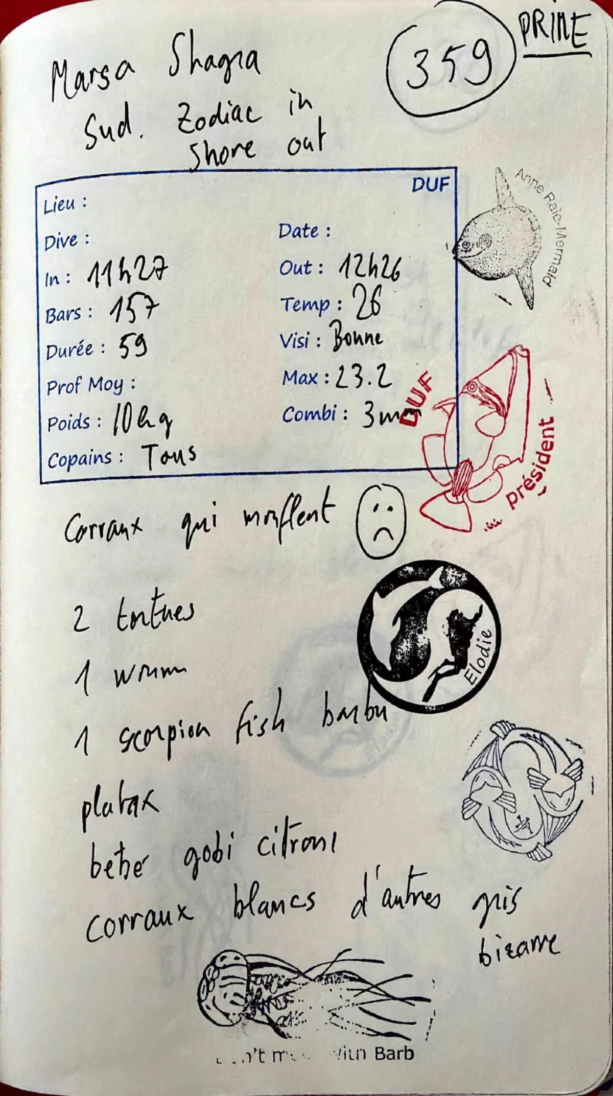 Plongée #359 — Housereef South 🔢Marsa Shagra 17 novembre 2024🕐 11:27 ⏱ 59 min ↓ 23.2 m 🌡 26°C 🫧 157 bar ⚖ 10 kg Zodiac in / shore outDuf Barbara Elo Yanick Anne BurgiPRIME. Combi 3mm. Out 12:26. Visi bonne. Courants qui maflent :(. 2 tortues. 1 worm. 1 scorpion fish barbu. Platax. Bebe gobi citrons. Corraux blancs d'autres pis bizarreVie marineSea Turtle Scorpionfish Batfish Lemon GobyPage du carnet