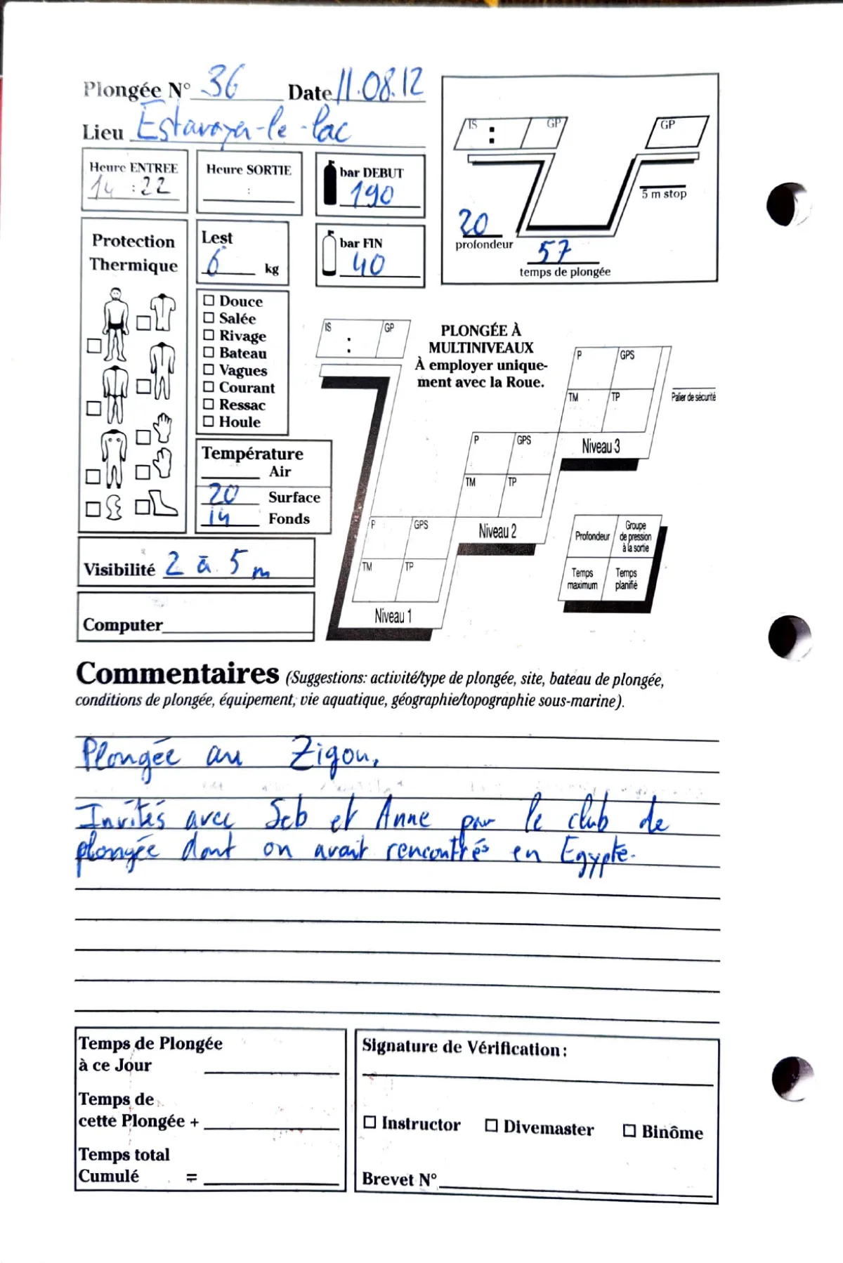 Plongée #36 — ZigouEstavayer-le-Lac 11 août 2012🕐 14:22 ⏱ 57 min ↓ 20 m 🌡 14°C 🫧 150 bar ⚖ 6 kg rivageAvec Seb + AnnePlongee au Zigou. Invites avec Seb et Anne par le club de plongee dont on avait rencontres en EgyptePage du carnet