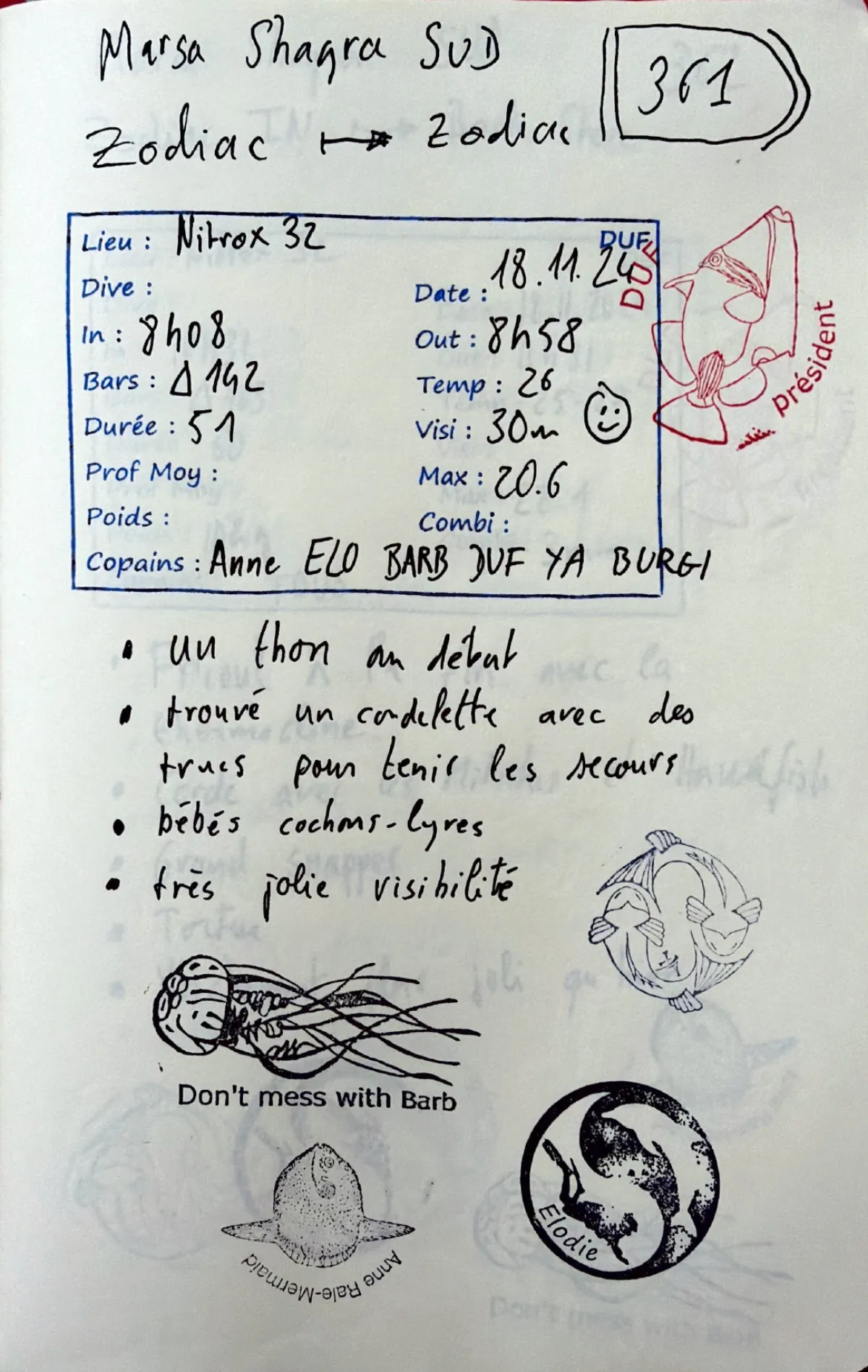 Nitrox 32. Combi 3mm. Out 08:58. Visi 30m :). Delta-P 142 bars. Un thon au debut. Trouve une cordelette avec des trucs pour tenir les secours. Bebes labres a queue de lyre. Tres jolie visibilite