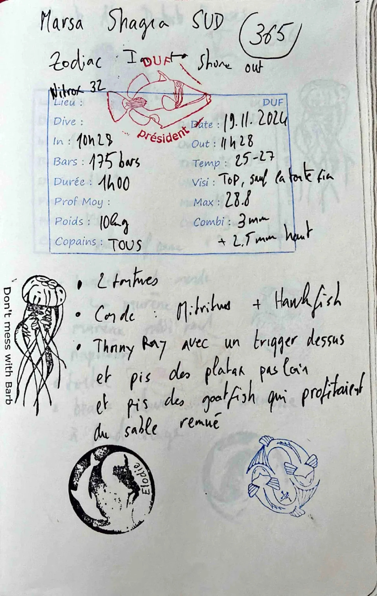 Nitrox 32. Combi 3mm + 2.5mm haut. Out 11:28. Visi top, sauf la toute fin. 2 tortues. Corde : Mitritus + Hawkfish. Thorny ray avec un trigger dessus et pis des platax pas loin et pis des goatfish qui profitaient du sable remue