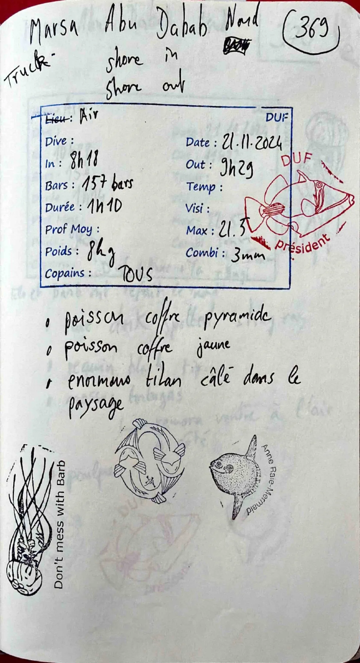 Plongée #369 — Marsa Abu DababMarsa Shagra 21 novembre 2024🕐 08:18 ⏱ 70 min ↓ 21.5 m 🫧 157 bar ⚖ 8 kg Truck, shore in / shore outDuf Barbara Elo Yanick Anne BurgiAir. Combi 3mm. Out 09:29. Marsa Abu Dabab Nord. Poisson coffre pyramide. Poisson coffre jaune. Enormus titan cale dans le paysageVie marineBoxfish Yellow Boxfish Titan TriggerfishPage du carnet