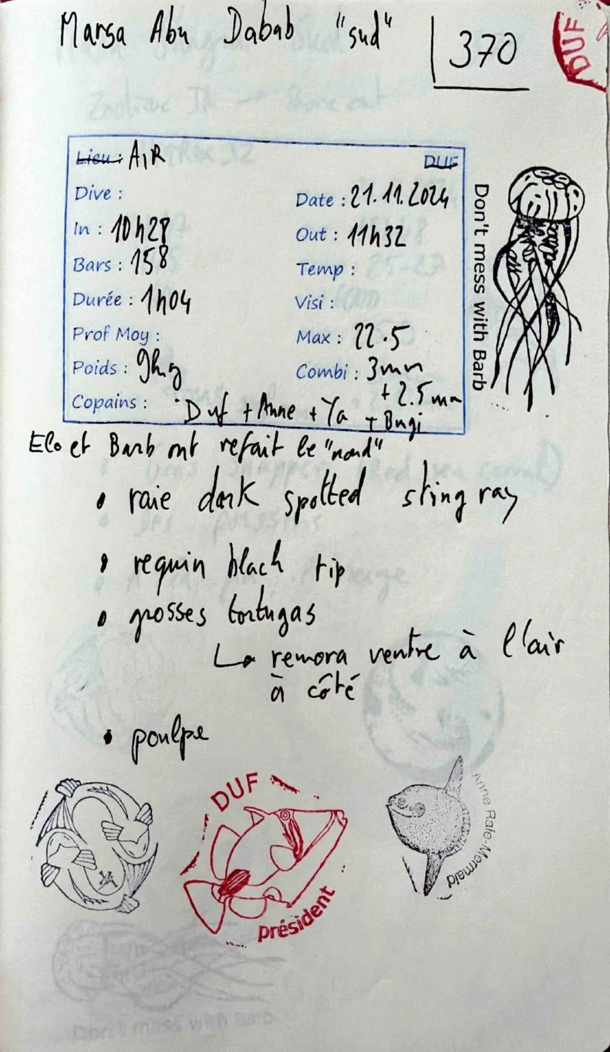 Plongée #370 — Marsa Abu DababMarsa Shagra 21 novembre 2024🕐 10:28 ⏱ 64 min ↓ 22.5 m 🫧 158 bar ⚖ 9 kgDuf Anne Yanick BurgiAir. Combi 3mm + 2.5mm. Out 11:32. Marsa Abu Dabab "sud". Elo et Barb ont refait le "nord". Raie dark spotted stingray. Requin black tip. Grosses tortugas. La remora ventre a l'air a cote. PoulpeVie marineDark-Spotted Stingray Blacktip Reef Shark Sea Turtle Remora OctopusPage du carnet