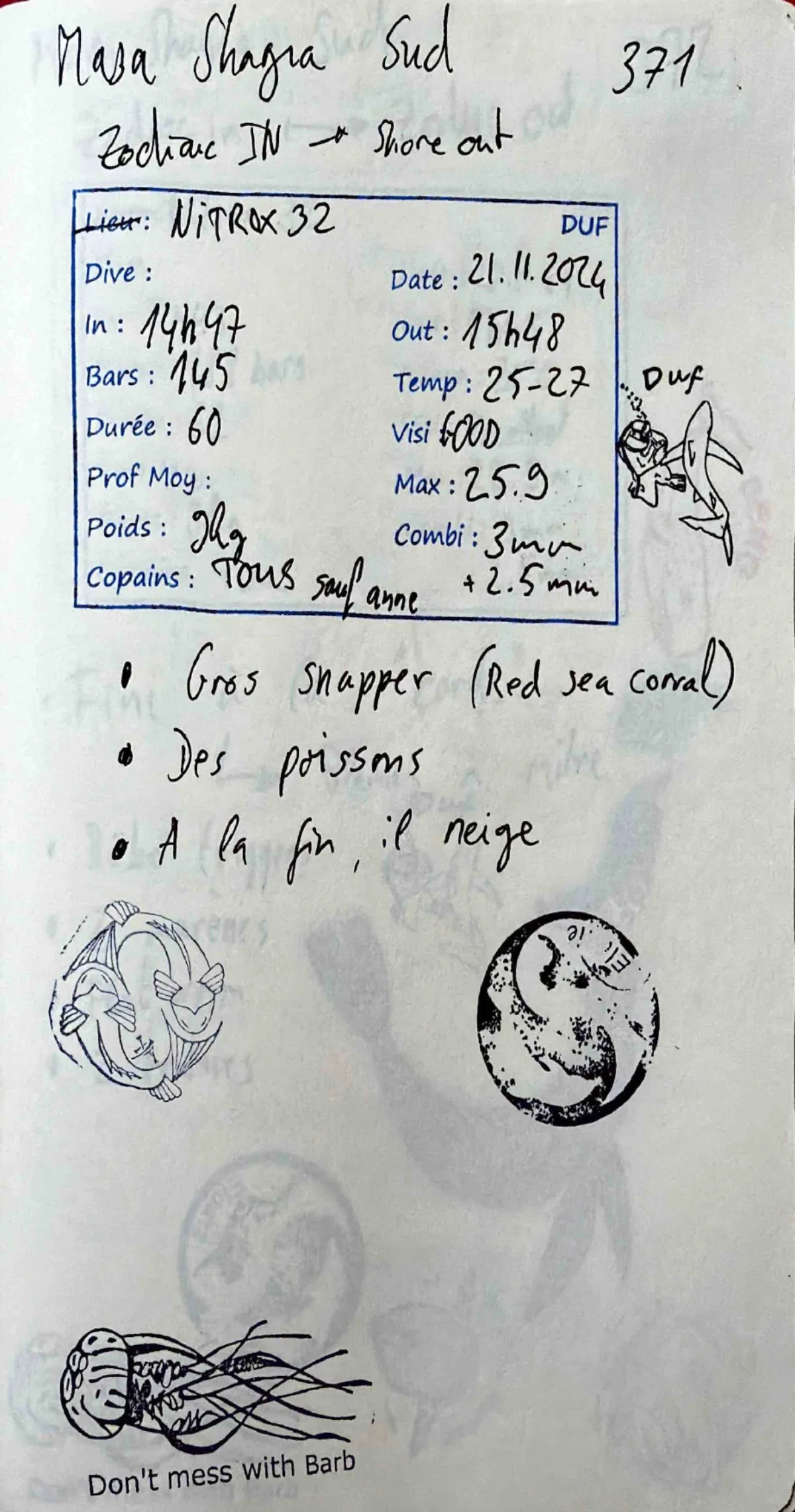 Plongée #371 — Housereef SouthMarsa Shagra 21 novembre 2024🕐 14:47 ⏱ 60 min ↓ 25.9 m 🌡 25-27°C 🫧 145 bar ⚖ 9 kg Zodiac in / shore outDuf Barbara Elo Yanick BurgiNitrox 32. Combi 3mm + 2.5mm. Out 15:48. Visi good. Tous sauf Anne. Gros snapper (Red sea coral). Des poissons. A la fin, il neigeVie marineSnapperPage du carnet