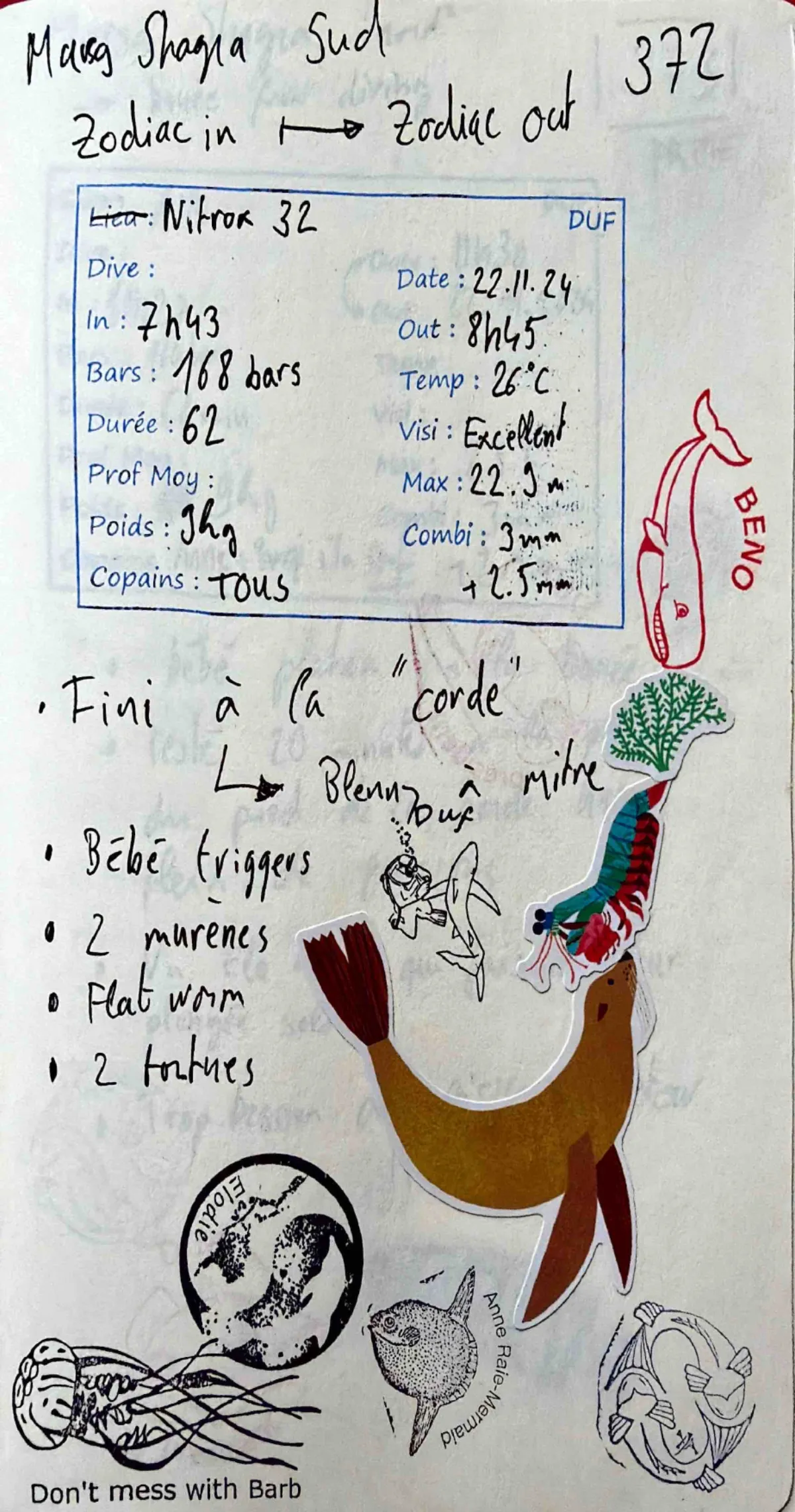Plongée #372 — Housereef SouthMarsa Shagra 22 novembre 2024🕐 07:43 ⏱ 62 min ↓ 22.9 m 🌡 26°C 🫧 168 bar ⚖ 9 kg Zodiac in / zodiac outDuf Barbara Elo Yanick Anne BurgiNitrox 32. Combi 3mm + 2.5mm. Out 08:45. Visi excellente. Fini a la "corde". Blenny a mitre. Bebe triggers. 2 murenes. Flat worm. 2 tortuesVie marinePetroscirtes Mitratus Triggerfish Moray Eel Flatworm Sea TurtlePage du carnet