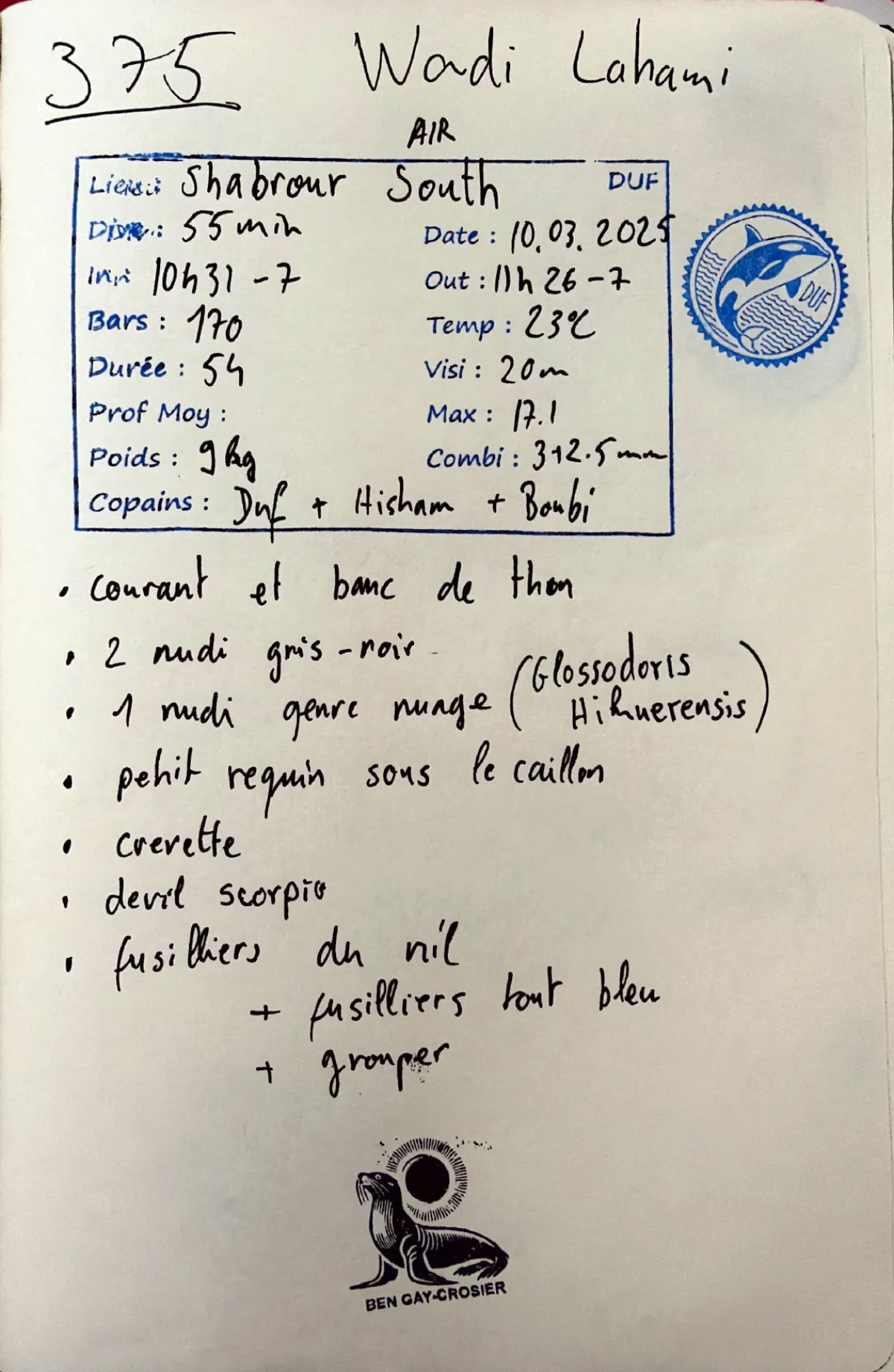 Air. Combi 3mm + 2.5mm. Out 11:26. Visi 20m. Courant et banc de thon. 2 nudi gris-noir. 1 nudi genre nuage (Glossodoris hikuerensis). Petit requin sous le caillou. Crevette. Devil scorpio. Fusiliers du nil + fusiliers tout bleu. Grouper