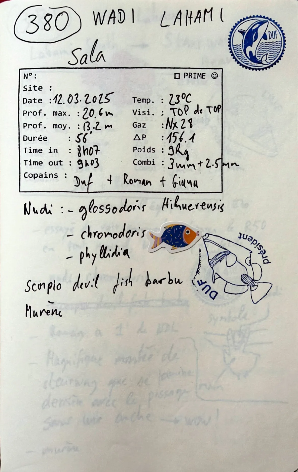 Plongée #380 — SalaWadi Lahami 12 mars 2025🕐 08:07 ⏱ 56 min ↓ 20.6 m 🌡 23°C ⚖ 9 kg BoatDuf Roman JanaNitrox 28. Combi 3mm + 2.5mm. Out 09:03. Prof moy 13.2m. Visi top de top. Delta-P 156.1. Nudi: glossodoris hikuerensis, chromodoris, phyllidia. Scorpio devil fish barbu. MureneVie marineGlossodoris Hikuerensis Chromodoris Phyllidia Scorpionfish Moray EelPage du carnet