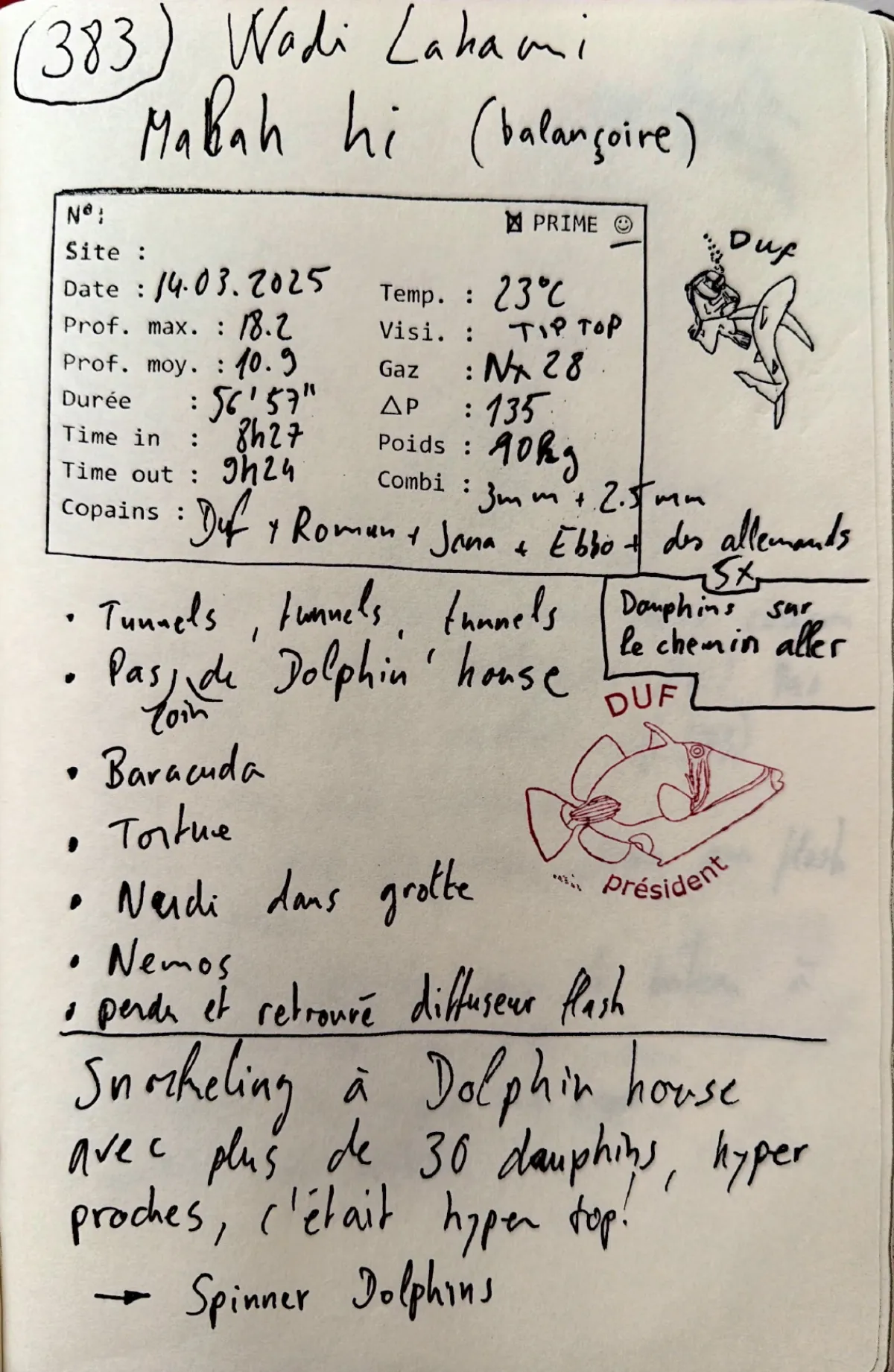 PRIME. Nitrox 28. Combi 3mm + 2.5mm. Out 09:24. Prof moy 10.9m. Visi tip top. Delta-P 135. Balancoire. Tunnels, tunnels, tunnels. Pas de Dolphin House (trop loin). Baracuda. Tortue. Nudi dans grotte. Nemos. Perdu et retrouve diffuseur flash. Dauphins sur le chemin aller. Snorkeling a Dolphin House avec plus de 30 dauphins, hyper proches, c'etait hyper top! → Spinner Dolphins