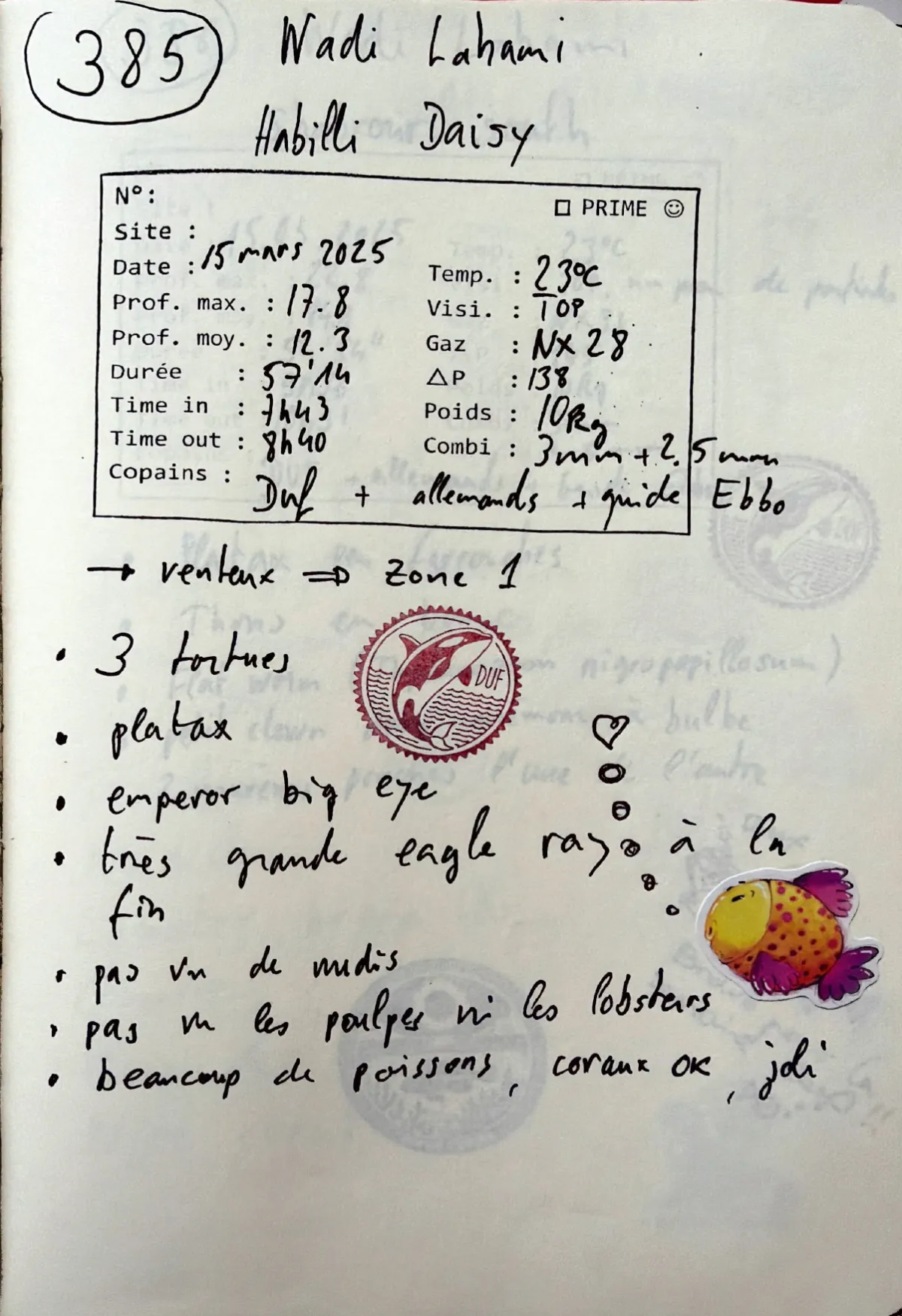 Nitrox 28. Combi 3mm + 2.5mm. Out 08:40. Prof moy 12.3m. Visi top. Delta-P 138. Venteux → zone 1. 3 tortues. Platax. Emperor big eye. Tres grande eagle ray a la fin. Pas vu de nudis. Pas vu les poulpes ni les lobsters. Beaucoup de poissons, coraux OK, joli