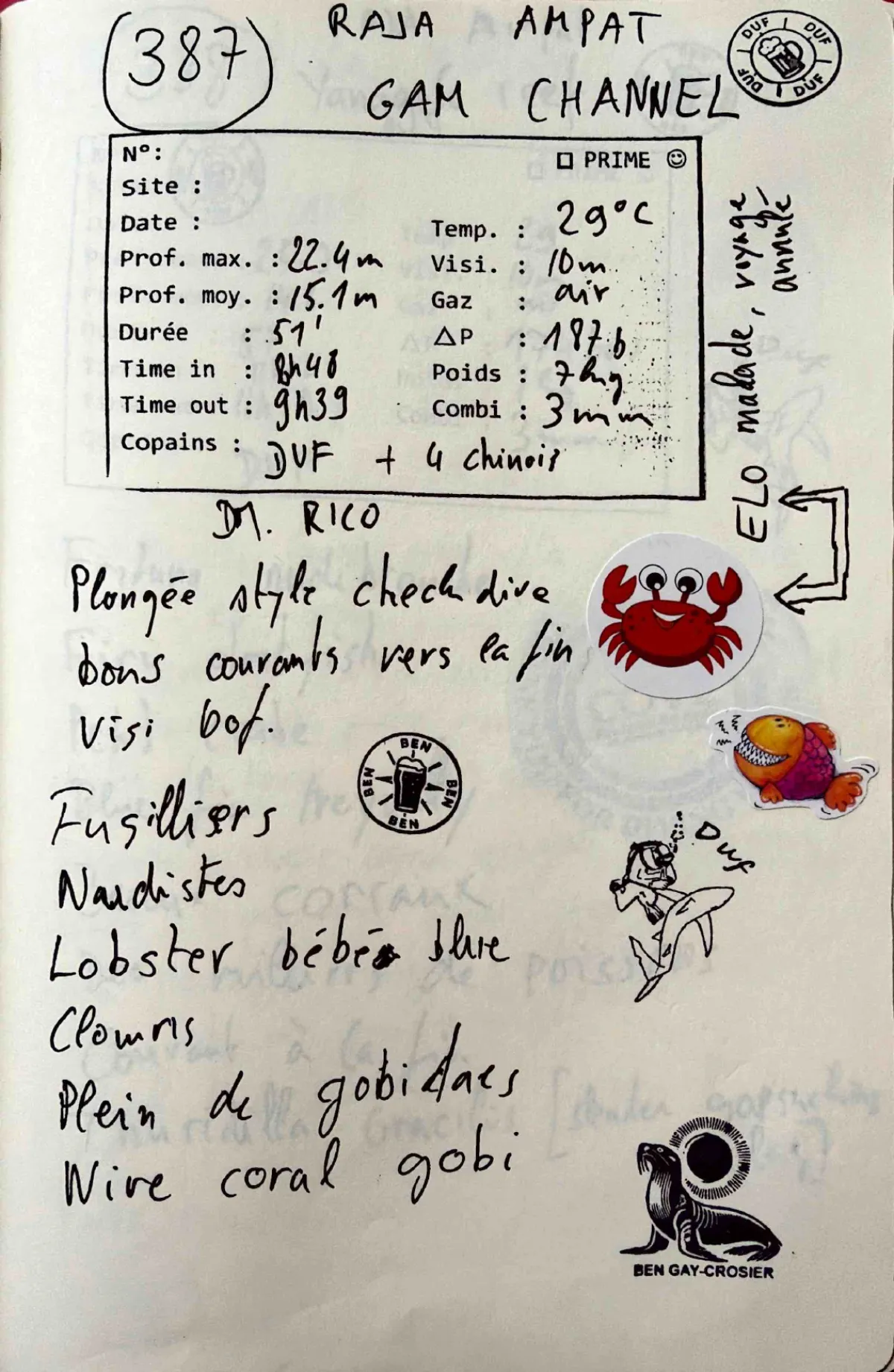 Plongée #387 — Gam ChannelRaja Ampat 16 septembre 2025🕐 08:48 ⏱ 51 min ↓ 22.4 m 🌡 29°C ⚖ 7 kg BoatDuf DM RicoAir. Combi 3mm. Out 09:39. Prof moy 15.1m. Visi 10m. Delta-P 187.6. Plongee style check dive. Bons courants vers la fin. Visi bofVie marineFusilier Nudibranch Lobster Clownfish Goby Wire Coral GobyPage du carnet