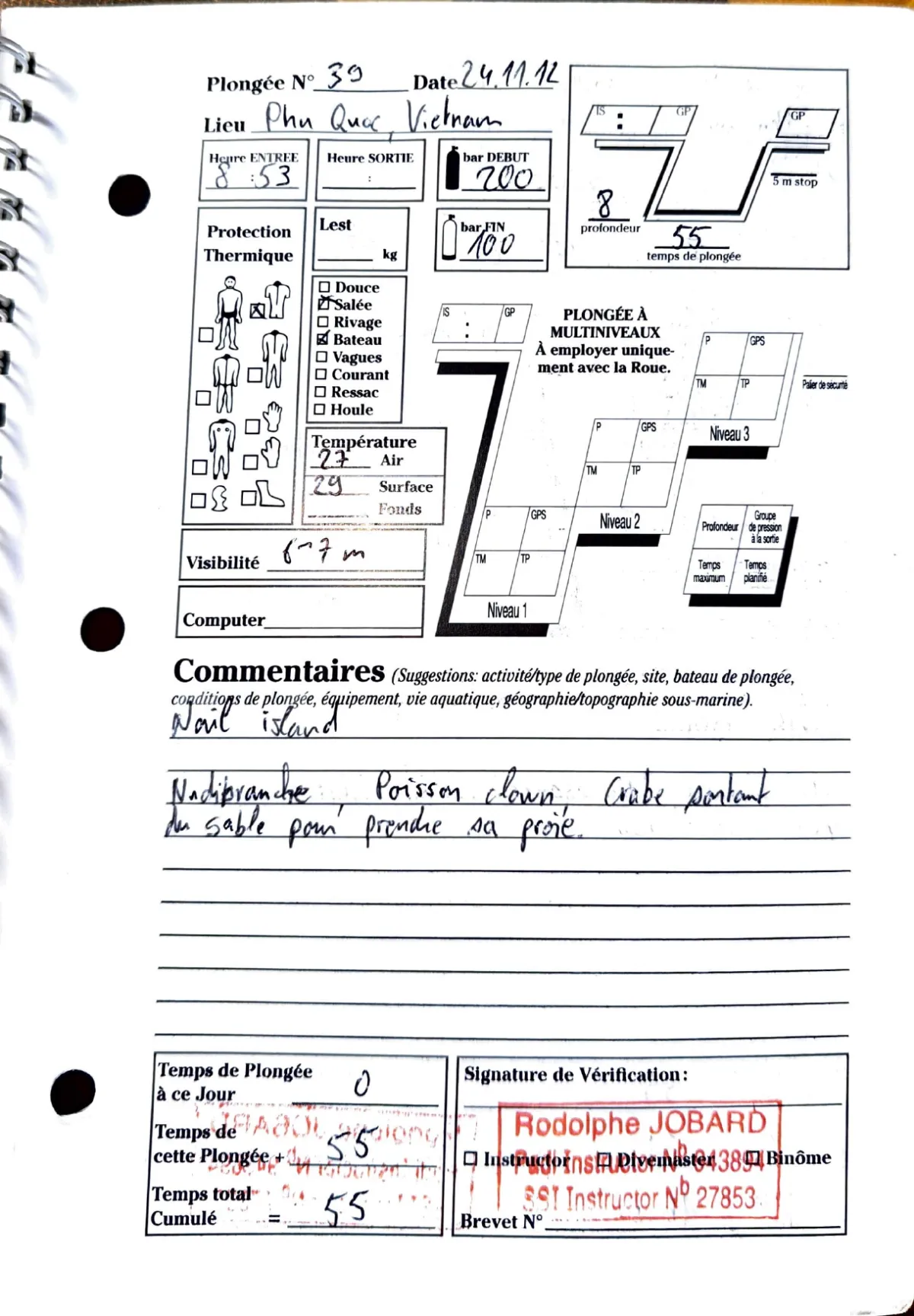 Plongée #39 — Nail IslandPhu Quoc 24 novembre 2012🕐 08:53 ⏱ 55 min ↓ 8 m 🌡 27°C 🫧 100 bar rivage + bateauNudibranche, poisson clown, crabe sortant du sable pour prendre sa proiePage du carnet