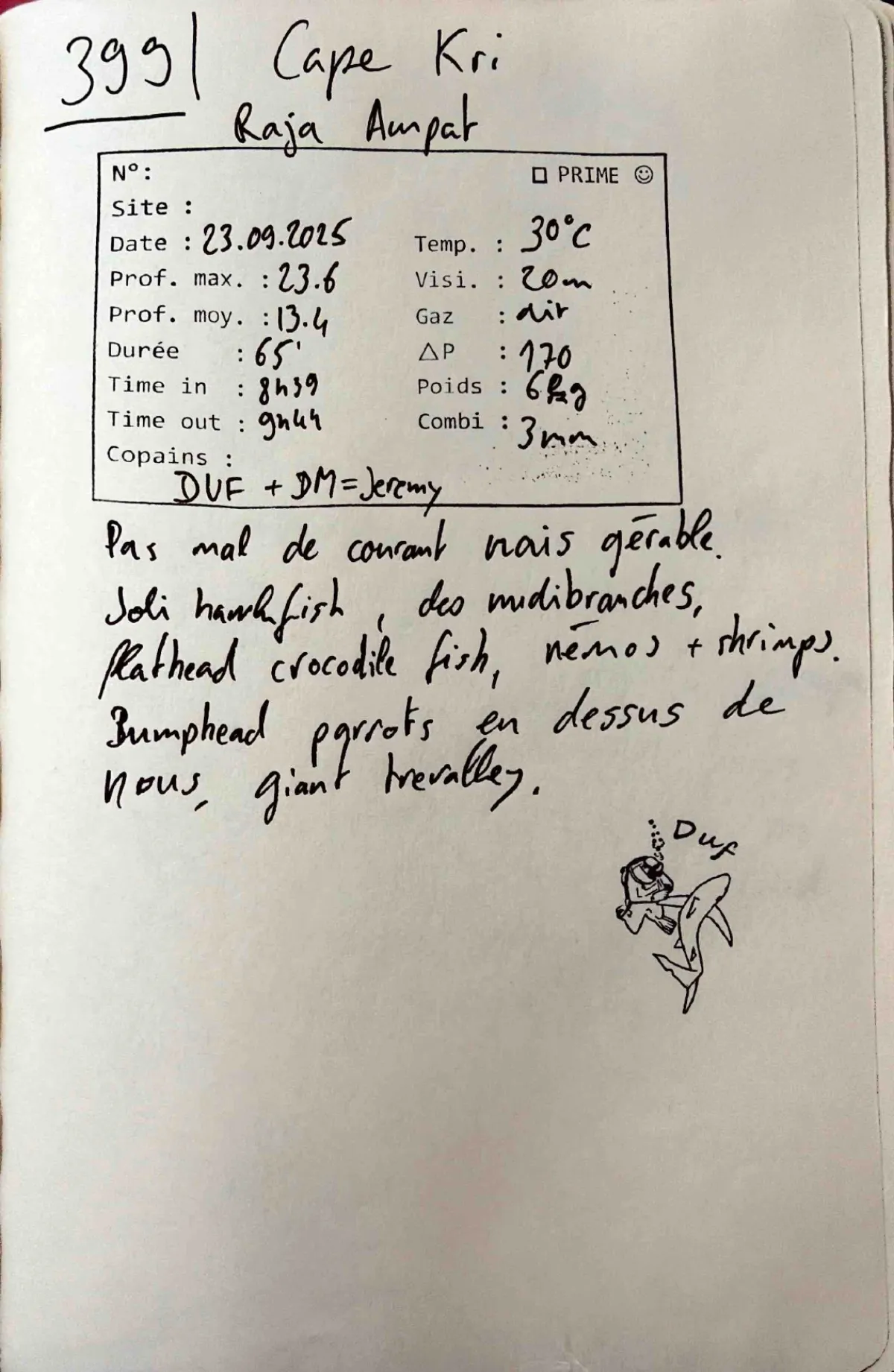 Plongée #399 — Cape KriRaja Ampat 23 septembre 2025🕐 08:39 ⏱ 65 min ↓ 23.6 m 🌡 30°C ⚖ 6 kg BoatDuf DM JeremyAir. Combi 3mm. Out 09:44. Prof moy 13.4m. Visi 20m. Delta-P 170. Pas mal de courant mais gerableVie marineHawkfish Nudibranch Flathead Crocodilefish Clownfish Shrimp Bumphead Parrotfish Giant TrevallyPage du carnet
