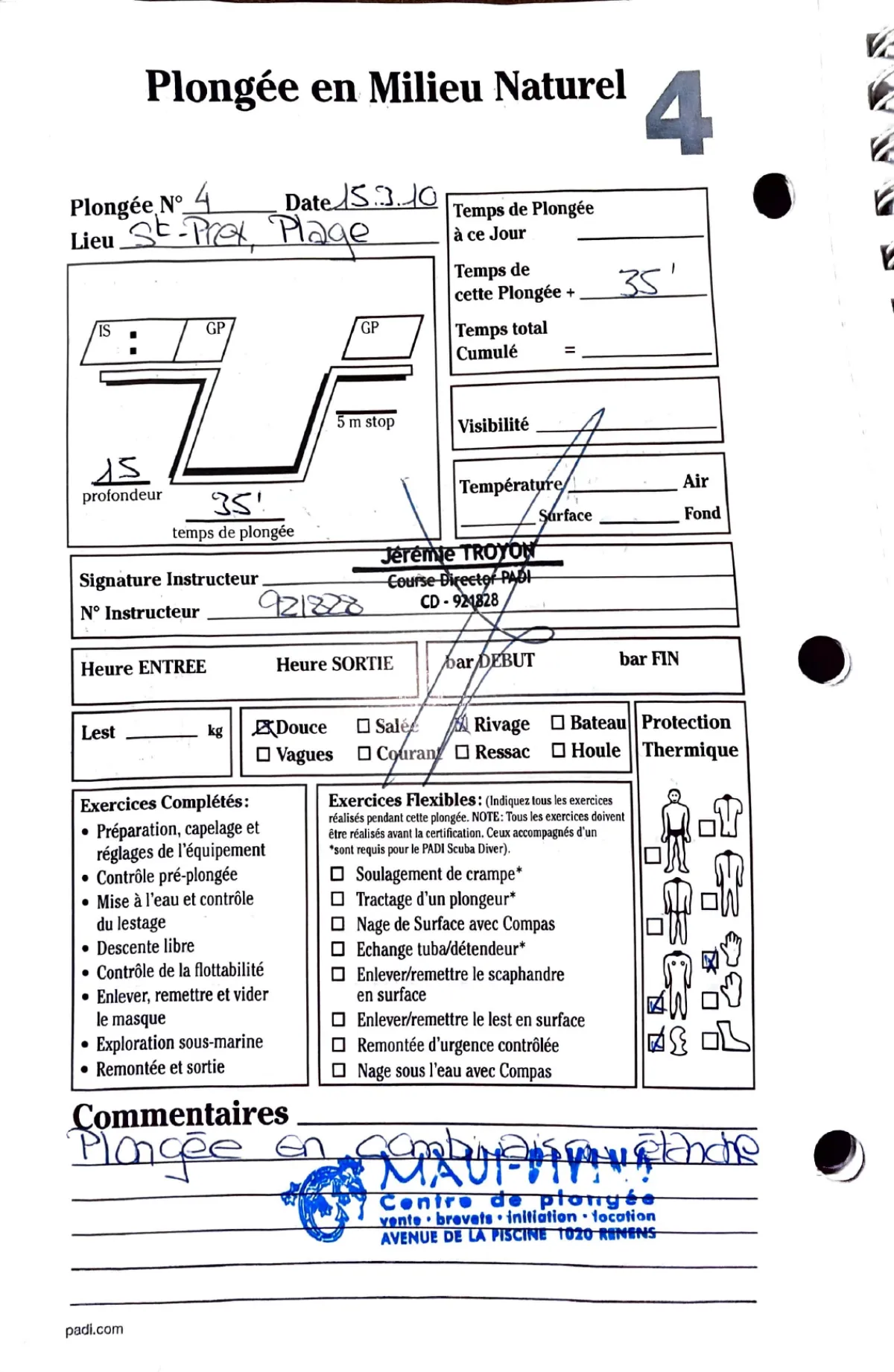 Plongée #4 — St-Prex PlageLac Léman 15 mars 2010⏱ 35 min ↓ 15 m rivageFormation OWD plongée 4. Plongee en combinaison etanchePage du carnet