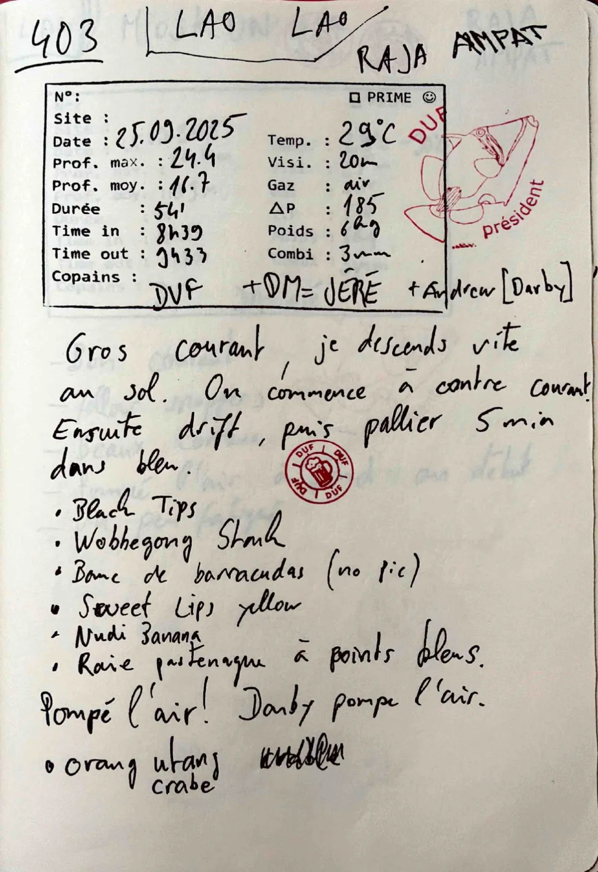 Plongée #403 — Lao LaoRaja Ampat 25 septembre 2025🕐 08:39 ⏱ 54 min ↓ 24.4 m 🌡 29°C ⚖ 6 kg BoatDuf Andrew DM JeremyAir. Combi 3mm. Out 09:33. Prof moy 16.7m. Visi 20m. Delta-P 185. Gros courant, descente rapide. Contre courant puis drift puis pallier 5min dans bleu. Pompe l'air! Darby pompe l'airVie marineBlacktip Reef Shark Wobbegong Shark Barracuda Sweetlips Nudibranch Blue-Spotted Stingray Orangutan CrabPage du carnet