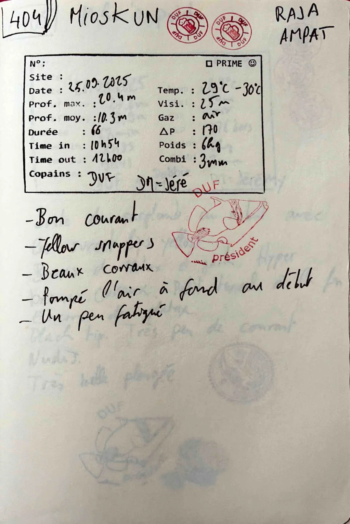 Plongée #404 — MioskunRaja Ampat 25 septembre 2025🕐 10:54 ⏱ 66 min ↓ 20.4 m 🌡 29°C ⚖ 6 kg BoatDuf DM JeremyAir. Combi 3mm. Out 12:00. Prof moy 10.3m. Visi 25m. Delta-P 170. Bon courant. Yellow snappers. Beaux coraux. Pompe l'air a fond au debut. Un peu fatigueVie marineYellow SnapperPage du carnet
