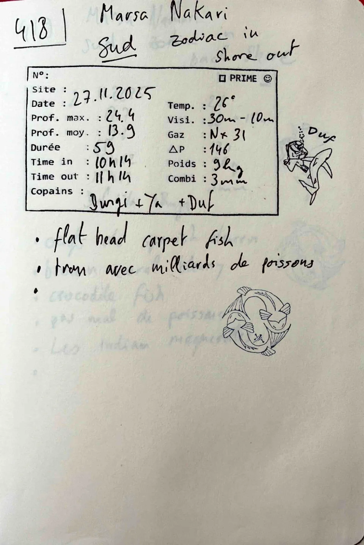 Plongée #418 — Housereef SouthMarsa Nakari 27 novembre 2025🕐 10:14 ⏱ 59 min ↓ 24.4 m 🌡 26°C ⚖ 9 kg BoatBurgi Yanick DufNitrox 31. Combi 3mm. Out 11:14. Prof moy 13.9m. Visi 30-10m. Delta-P 146. Zodiac in, shore out. Trou avec milliards de poissonsVie marineFlathead CrocodilefishPage du carnet