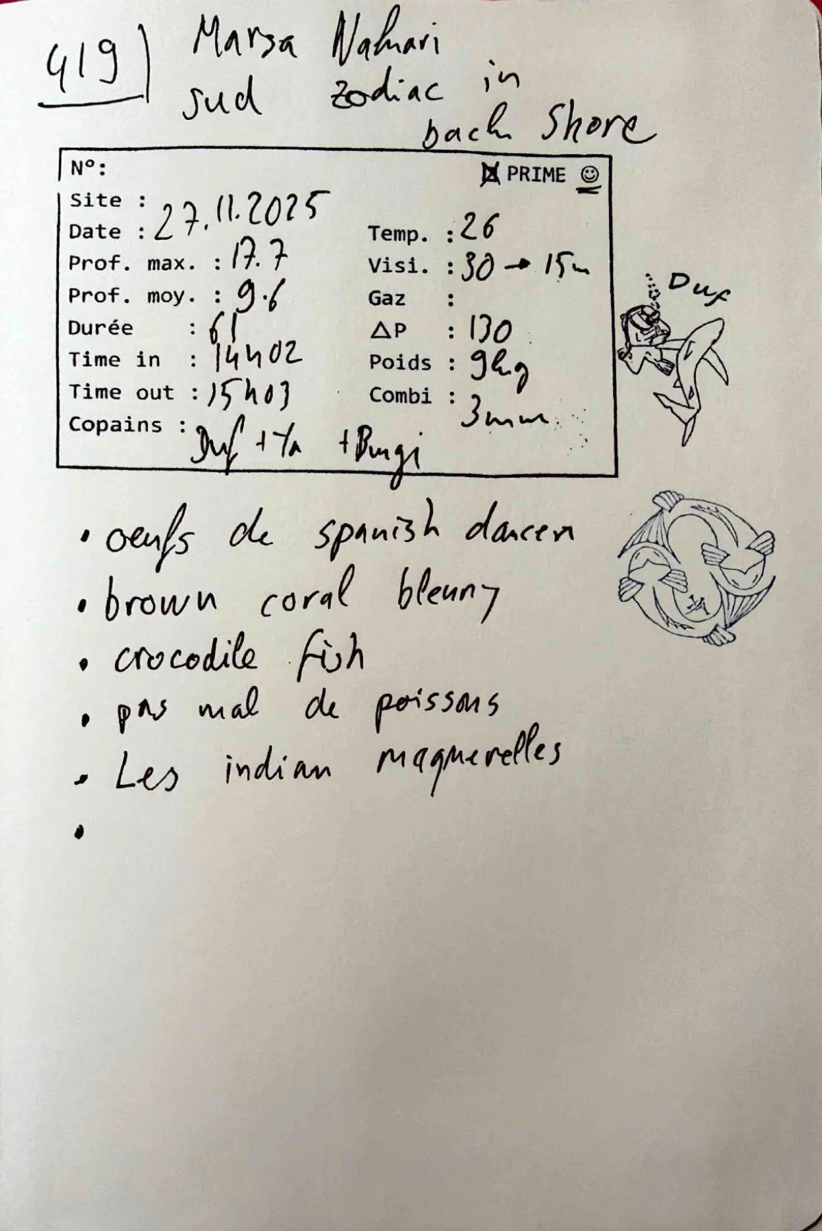 Plongée #419 — Housereef South 🔢Marsa Nakari 27 novembre 2025Blenny — 27 novembre 2025🕐 14:02 ⏱ 61 min ↓ 17.7 m 🌡 26°C ⚖ 9 kg BoatDuf Yanick BurgiAir. Combi 3mm. Out 15:03. Prof moy 9.6m. Visi 30-15m. Delta-P 130. Zodiac in, back shore. Oeufs de spanish dancerVie marineBlenny Crocodilefish Indian MackerelPage du carnet