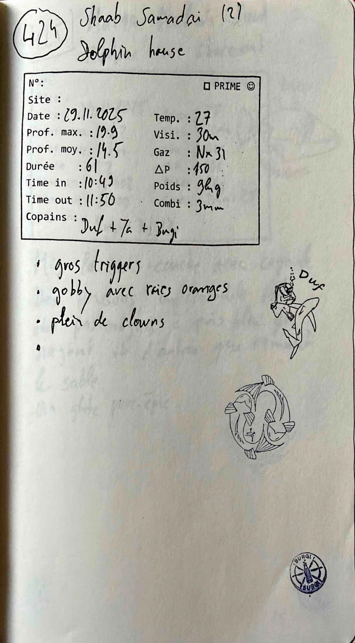 Plongée #424 — Shaab SamadaiMarsa Nakari 29 novembre 2025Babies — 29 novembre 2025Little guy in anemone — 29 novembre 2025Titan triggerfish — 29 novembre 2025🕐 10:49 ⏱ 61 min ↓ 19.9 m 🌡 27°C ⚖ 9 kg BoatDuf Yanick BurgiNitrox 31. Combi 3mm. Out 11:50. Prof moy 14.5m. Visi 30m. Delta-P 150. Dolphin House (2)Vie marineTriggerfish Goby ClownfishPage du carnet