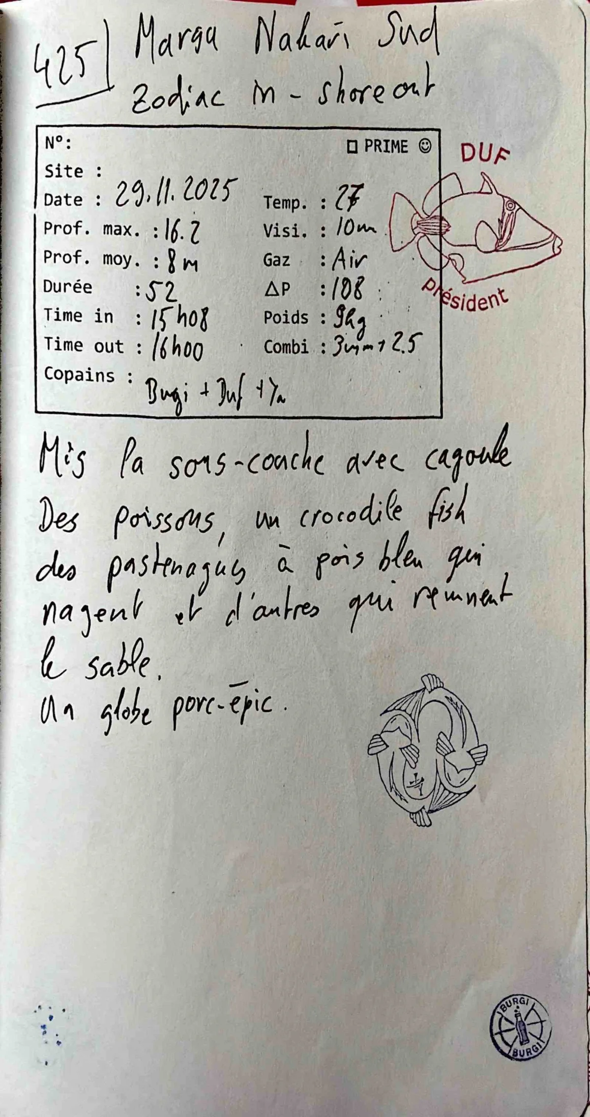 Plongée #425 — Housereef SouthMarsa Nakari 29 novembre 2025Crocodile carpet fish — 29 novembre 2025Pastenague a pois bleu — 29 novembre 2025🕐 15:08 ⏱ 52 min ↓ 16.2 m 🌡 27°C ⚖ 9 kg BoatBurgi Duf YanickAir. Combi 3mm + 2.5mm. Out 16:00. Prof moy 8.0m. Visi 10m. Delta-P 108. Mis la sous-couche avec cagoule. Pastenagues a pois bleu qui nagent et d'autres qui remuent le sableVie marineCrocodilefish Blue-Spotted Stingray PorcupinefishPage du carnet