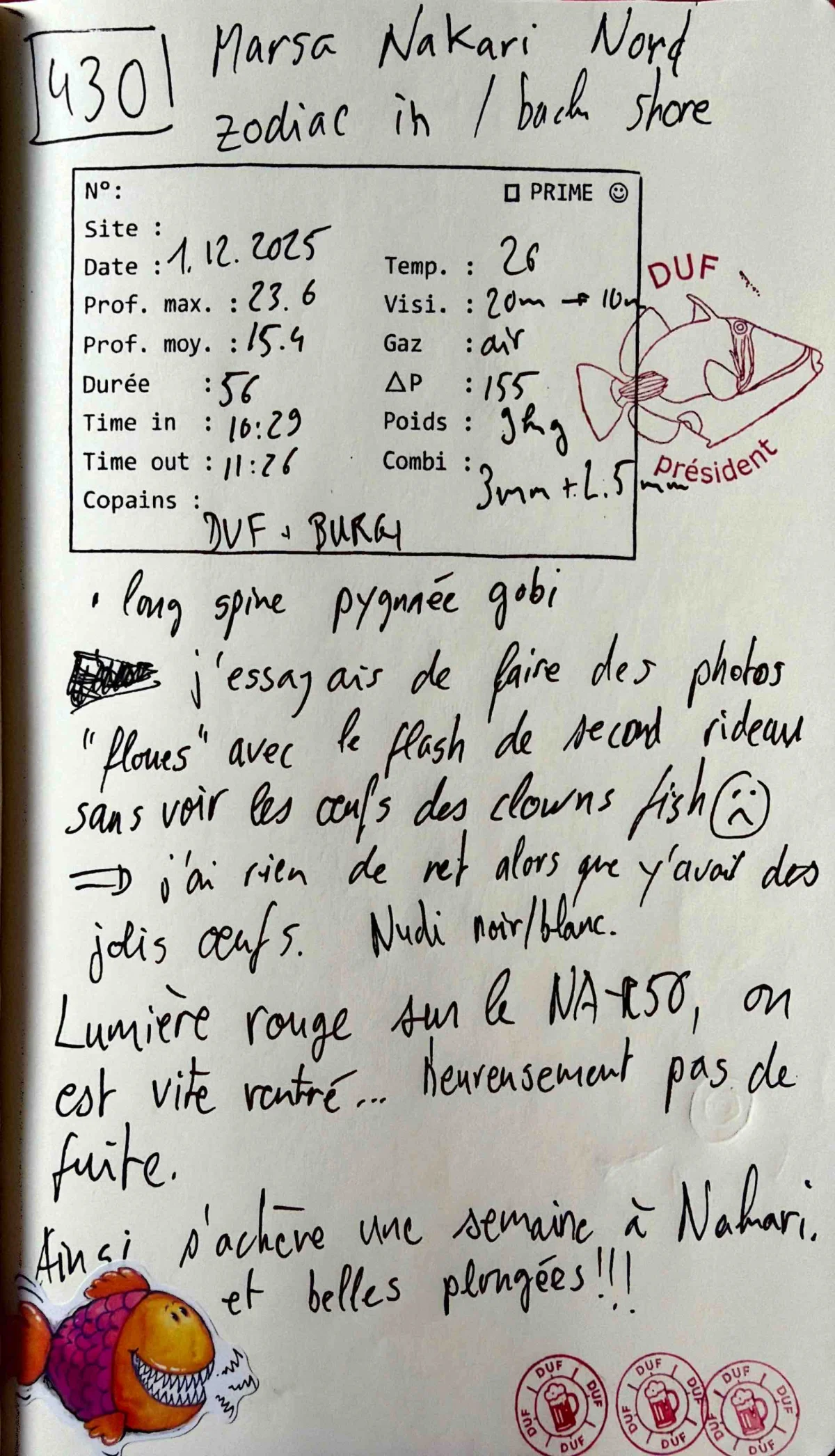 Air. Combi 3mm + 2.5mm. Out 11:26. Prof moy 15.4m. Visi 20-10m. Delta-P 155. Long spine pygmee gobi. Photos flash second rideau, pas vu les oeufs des clowns fish. Nudi noir/blanc. Lumiere rouge sur le NA-R50, vite rentre, pas de fuite. Ainsi s'acheve une semaine a Nakari, et belles plongees!!!