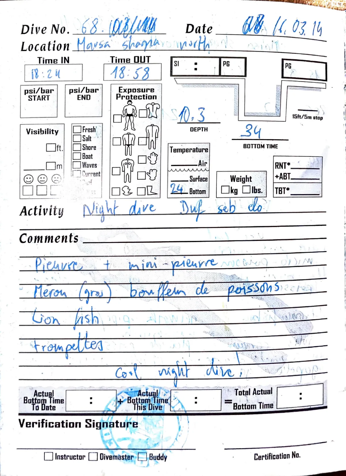 Plongée #68 — Marsa Shagra NordMarsa Shagra 16 mars 2014🕐 18:24 ⏱ 34 min ↓ 10.3 m 🌡 24°C rivageAvec Duf + Seb + EloNight dive. Pieuvre + mini-pieuvre, merou (gros), bon plein de poissons, lion fish, trompettes. Cool night dive!Page du carnet