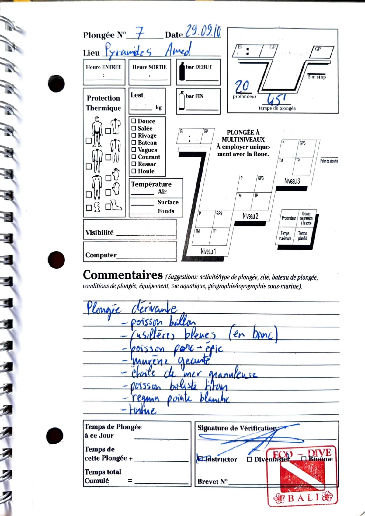 Plongée #7 — Pyramides AmedBali 29 septembre 2010⏱ 65 min ↓ 20 mPlongee derivante. Poisson ballon, fusilieres bleues en banc, poisson porc-epic, murene geante, etoile de mer granuleuse, baliste titan, requin pointe blanche, tortuePage du carnet
